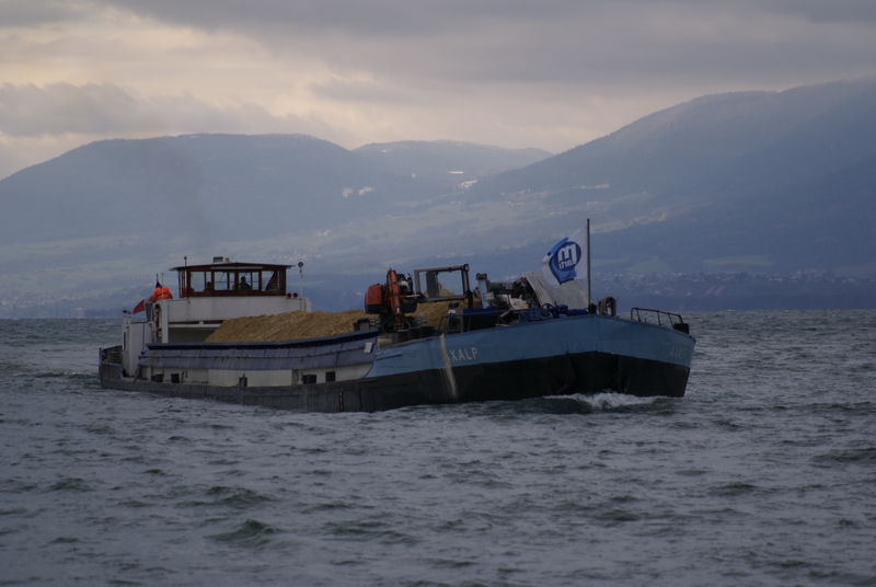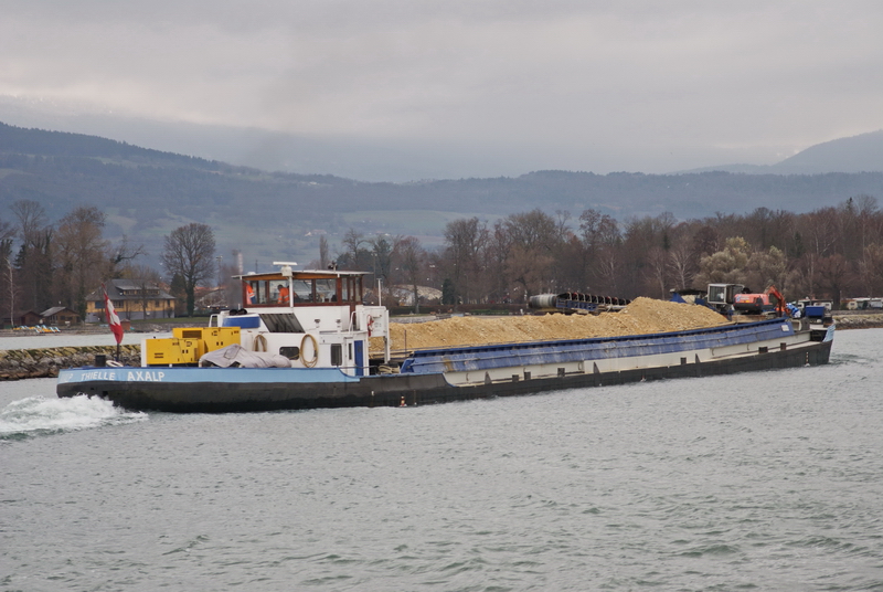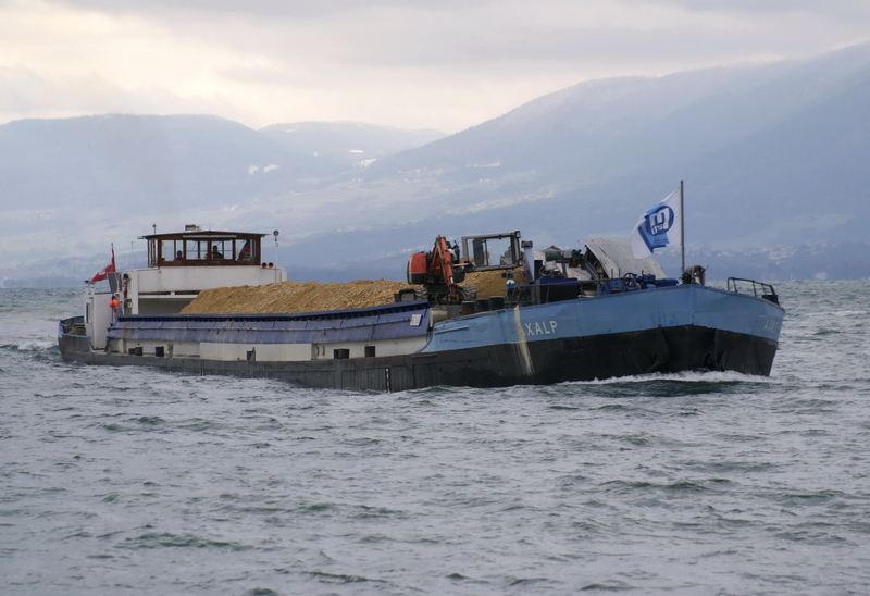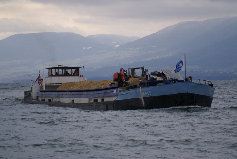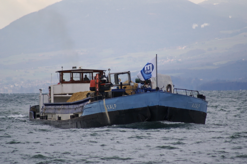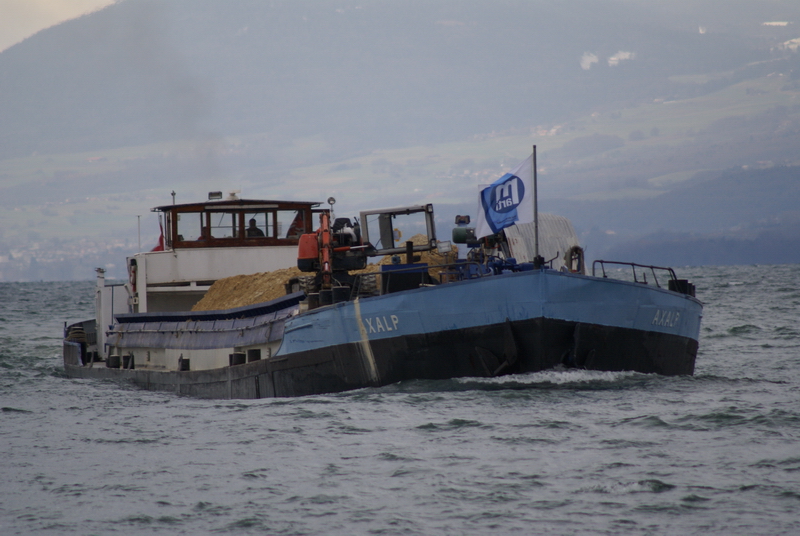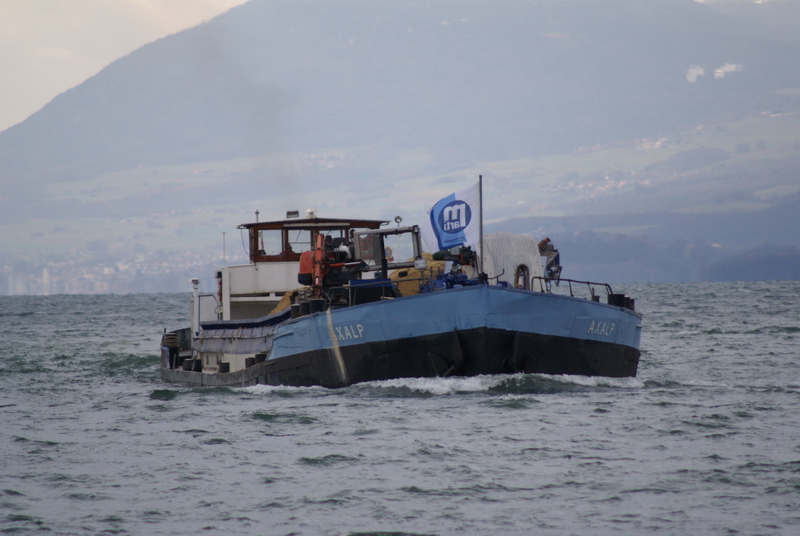 Histoire du navire Le chaland automoteur AXALP fut construit selon les plans de l’architecte naval suisse bien connu, Adolf J.Ryniker, par le chantier naval N.V. Scheepswerfen v/h H. H. Bodewes, Millingen a/d Rijn, avec le no de construction 422, pour l’armateur bâlois Basler Rheinschiffahrt AG (BRAG). La bateau fut livré à l’armateur le 11.08.1049 et fut mis en service sous pavillon suisse, immatriculation no. 427. Dès 1951, en été, un module à passagers contenant 4 cabines doubles, cambuse et salon fut installé devant le château arrière sur un pont renforçé. Ce module de 13 tonnes fut construit par le chantier naval Gutehoffnungshütte Oberhausen A.G., Rheinwerft, Walsum. D’après un croquis retrouvé, il y aurait aussi eu des cabines supplémentaires à l’avant du bateau. Ce module d’habitation ne fut cependant pas toujours utilisé. En hiver, le bateau navigait parfois comme bateau-école pour la formation des mousses de l’armement BRAG. Sinon, le module était déposé à terre pour l’hiver. 1968, vendu à BRAGTANK et, 1969, modifié et allongé par le chantier Rheinwerft in Mainz-Mombach pour devenir un chaland à gravier auto-déchargeant, il travailla dans la région bâloise. 04.11.1982, vendu à Fertigbeton AG, Basel et garde toujours son nom. En 1998, le bateau sera acheté par la société de construction Marti AG in Moosseedorf de Berne pour Pour ce travail, au chantier Schiffswerft Josef Braun GmbH & Co. KG à Speyer, l’Axalp fut d’abord coupé en deux dans le sens de la longueur, puis chaque moitié en quatre parties ce qui faisait 8 sections. Ces sections furent ensuite chargées sur des chalands pour Bâle, Auhafen, et ensuite par la route vers le chantier de Marti AG an der Aare à Arch (vers Granges). Voir aussi l’article paru dans le BAZ. Sur ce chantier de Arch, le bateau fut resoudé en deux parties, l’avant et l’arrière. Les deus parties frurent mises à l’eau et amenées séparemment sur le canal de la Thielle (canal reliant le Lac de Neuchâtel à celui de Bienne). Par manque de longueur suffisante de l’écluse de Port à Bienne, le bateau ne pouvait pas être reconstruit à cet endroit. A Thielle enfin, les deux sections seront resoudées, à l’eau. Voir article de Urs Vogelbacher dans le SVS-Journal du 6/1998 et Informations SwissShips sur le montage. Dès son exploitation sur le Lac de Neuchâtel, le bateau tranporte du gravat des chantiers autoroutiers et ferroviaires le long du lac vers le quai de déchargement à Thielle. Ce gravat est propre à la fabrication de ciment et est utilisé par la fabrique de ciment Juracime basée à proximité. Depuis quelques temps, le navire transporte ce gravat depuis Serrières, dernier chantier autoroutier en cours. Aujourd’hui, en janvier 2011, ces travaux sont presque terminés et l’Axalp navigue encore quelques jours à Morat. La question de savoir s’il y aura encore des contrats de transport dans le future est indéterminée. Aussi, une aussi longue carrière de dur travail a laissé des traces sur le navire et de grand travaux de réfection seraient nécessaires dans un proche avenir et, en fait, aucun chantier naval n’est équipé, dans toute la région, pour un éventuel carénage. Ainsi, nour pouvons estimer que les jours de ce navire sont comptés.
