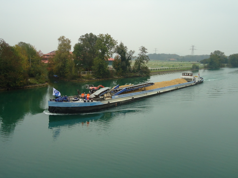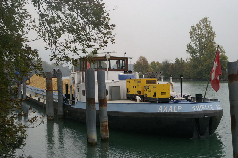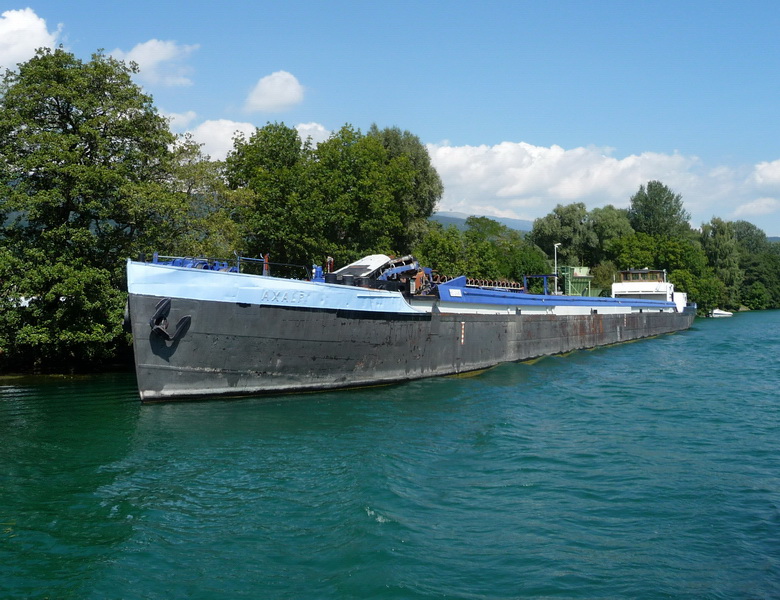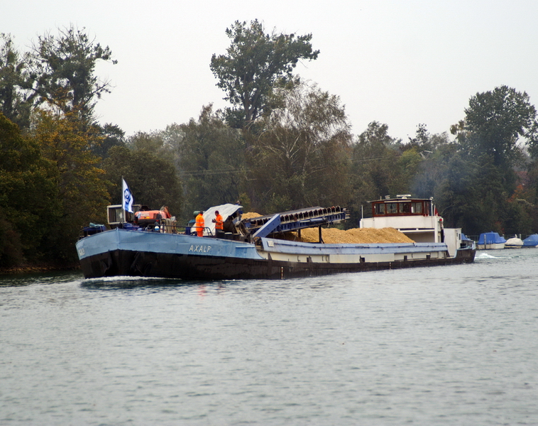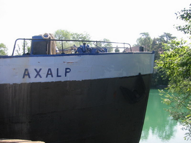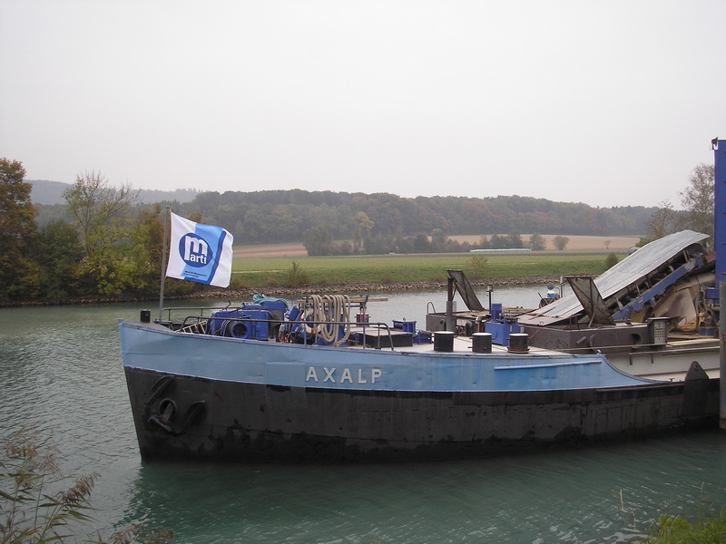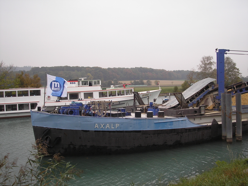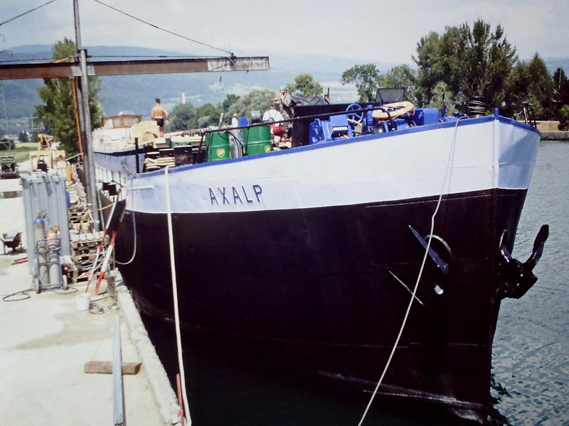 Cronistoria della nave La motochiatta fluviale AXALP viene costruita secondo i piani del rinomato ingegnere navale svizzero Adolf J. Ryniker presso il cantiere N.V. Scheepswerfen v/h H.H. Bodewes, Millingen a/d Rijn con il numero di costruzione 422, per la Basler Rheinschiffahrt AG (BRAG), Basilea. La consegna alla societá armatrice avviene il 11-08-1949 e messa in servizio sotto bandiera svizzera (numero matricola: 427). Dal 1951, d'estate viene montato un modulo con 4 cabine doppie, cucina e soggiorno a pruavia del ponte di comando. Questo modulo di 13 tonnellate viene costruito presso la Gutehoffnungshütte Oberhausen A.G., Rheinwerft. Da uno schizzo risulta, che altre cabine erano state montate a prua. Questo modulo aggiuntivo, non sempre é stato impiegato. In inverno, la motochiatta viene impiegata come nave scuola per la formazione dei mozzi della compagnia BRAG. D'inverno quando non lo si usa, questo modulo viene messo a terra. 1968, ceduta alla BRAGTANK e 19690 viene modificata ed allungata in chiatta per trasporto ghiaia autoscaricante (91m / 1447 tonn.) presso il cantiere Rheinwerft a Mainz-Mombach. Impiegata nel trasporto di ghiaia nell'area di Basilea. 1977 Venduta alla Rhein Umschlag AG, Muttenz, porto d'iscrizione Basilea. Nessun cambio nome. 04-11-1982 ceduta alla Fertigbeton AG, Basilea. Nessun cambio nome. Nel 1998 viene aquistata dalla impresa edile Marti AG di Moosseedorf nei pressi di Berna, la quale la impiega sul lago di Neuenburg. In questo periodo vengono costruite le gallerie autostradali e ferroviarie lungo le sponde del lago ed il materiale dei scavi viene portato via con motochiatte. Per rendere possible il trasporto dal Reno al fiume Aare, la chiatta viene tagliata in 6 sezioni. Per questo scopo, la AXALP viene tagliata prima in due segmenti longitudinali (dritta e sinistra), e queste a sua volta in segmenti prodieri centrali e poppieri, avendo cosí 6 sezioni. I lavori vengono eseguiti presso il cantiere Josef Braun GmbH & Co. Kg di Speyer. Queste sezione vengono trasportate tramite motochiatta fino a Basilea, e poi su strada al cantiere della Marti AG ad Arch (nei pressi di Grenchen) sul fiume Aare. Nel cantiere di Arch, la chiatta viene saldata in due pezzi, parte prodiera e parte poppiera. Le due sezioni vengono messe in acqua e separatamente rimorchiate sul Zihlkanal (canle che collega il lago di Biel e Neuenburg). Per la insufficiente lunghezza della chiusa di Port presso Biel, l'assemblaggiocompleto non puó essere eseguito. A Cornaux sul Canale di Zihl, le due sezioni vengono assemblate, orientate e saldate (vedi articolo di Urs Vogelbacher, pubblicato nella rivista SVS nr. 6/1998) e SwissShips informazioni sull'assemblaggio. Dopo la messa in servizio, la AXALP (Numero di registrazione NE2493) viene impiegata per trasportare il materiale scavato dai vari cantieri edili lungo il lago di Neuenburg, trasportandoli al porto di destinazione Cornaux sul canale Zihl. Tale materiale é adatto per la produzione di cemento e perció viene lavorato nella vicina fabbrica di cemento della Juracim. Da un po di tempo, la caricazione della motochiatta avviene all'ultimo cantiere a Serriére presso Neuenburg. Oggi, nel gennaio del 2011 i lavori sono maggiormente terminati e la AXALP viene impiegata uno o due giorni al mese. I parecchi anni che la motochiatta era in servizio, non sono passati senza lasciare trace e richiedono ormai enormi riparazioni, Purtroppo per motochiatte di queste dimensioni, sul lago di Neuenburg o lago di Biel non si trovano bacini adeguati. Cosí il destino di questa motochiatta sembra suggelato.