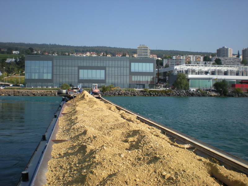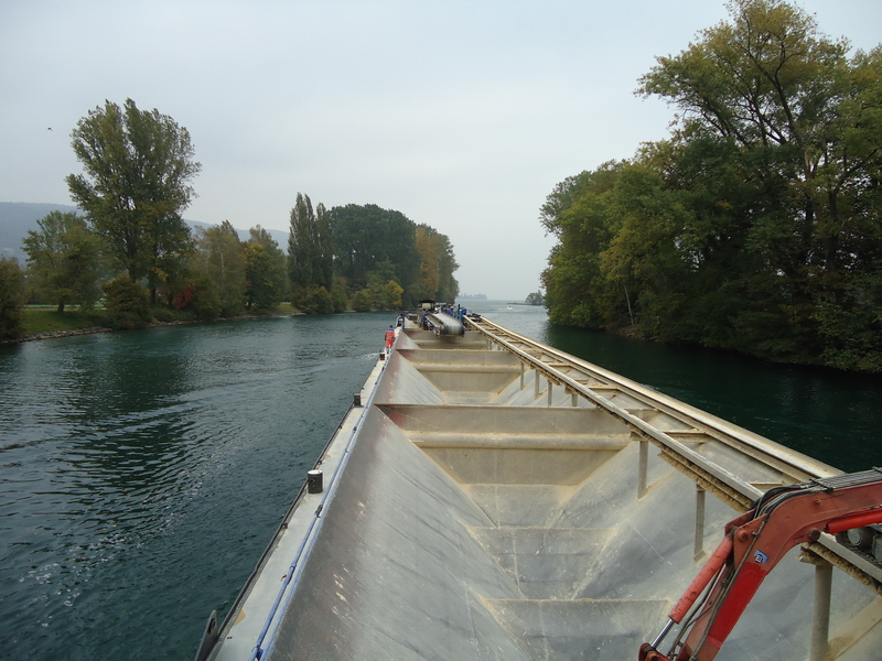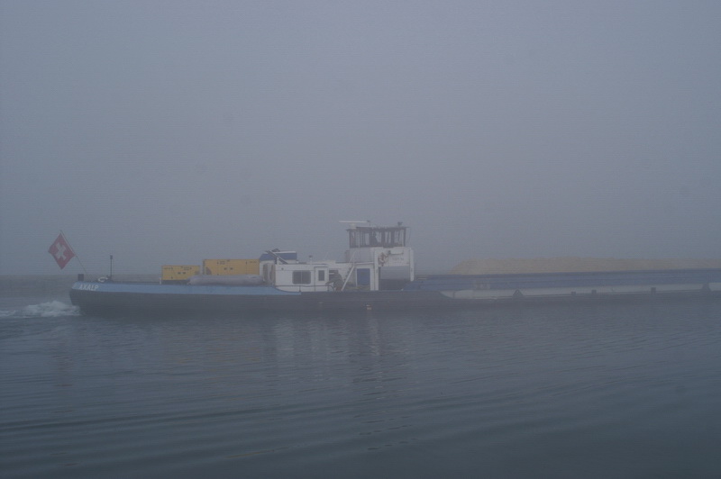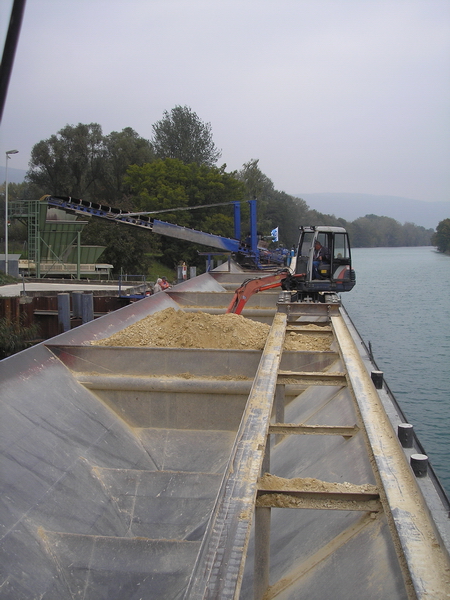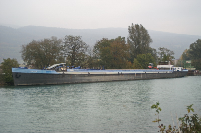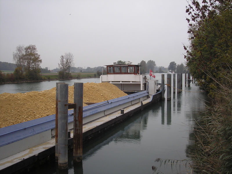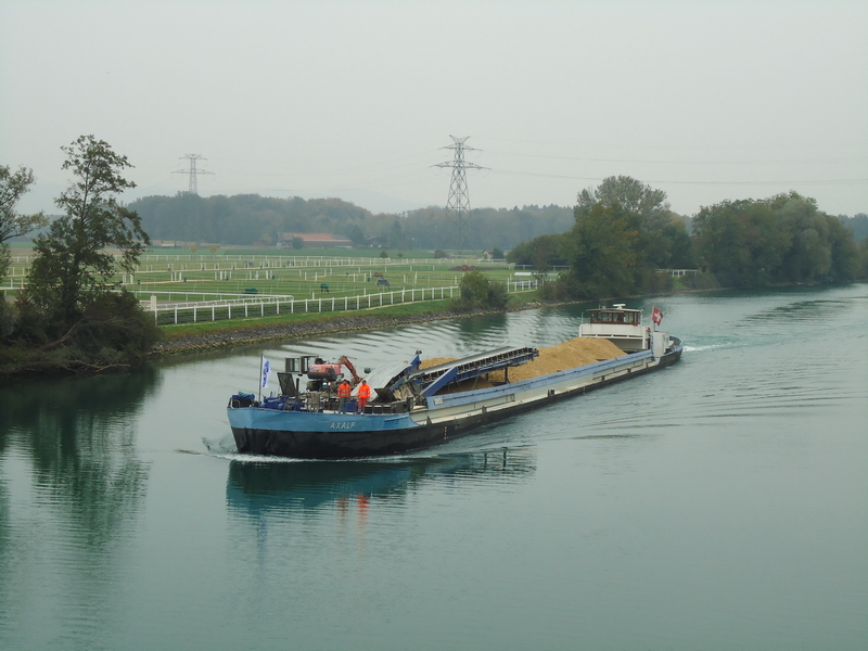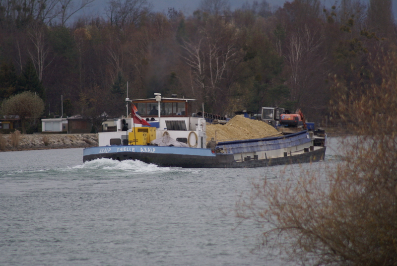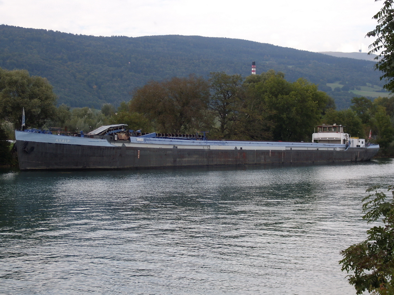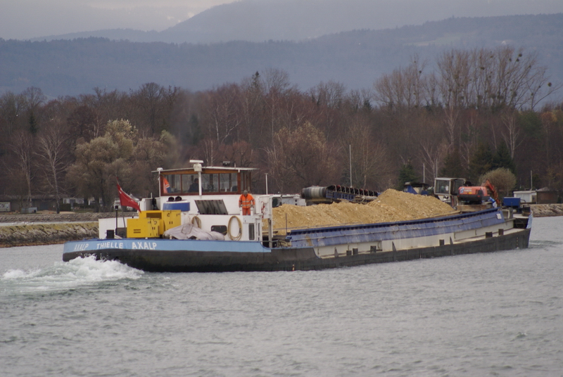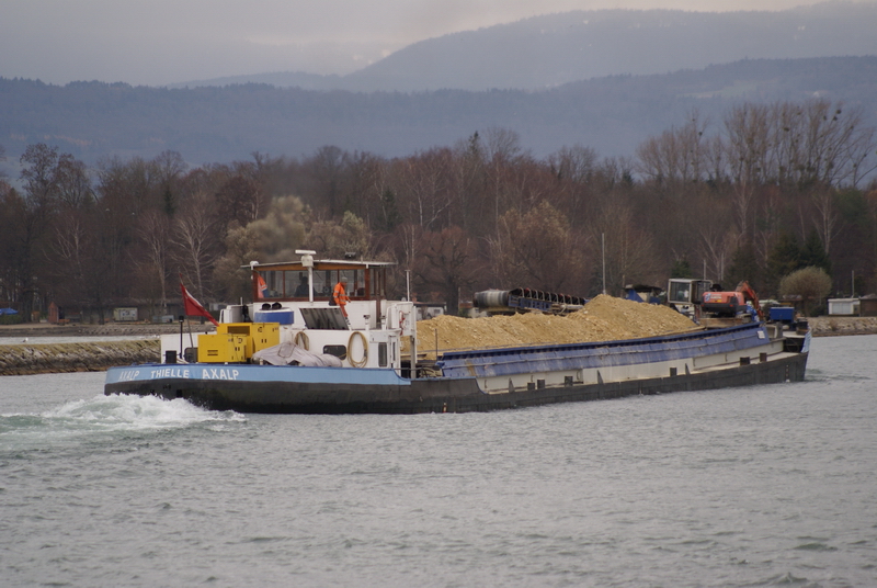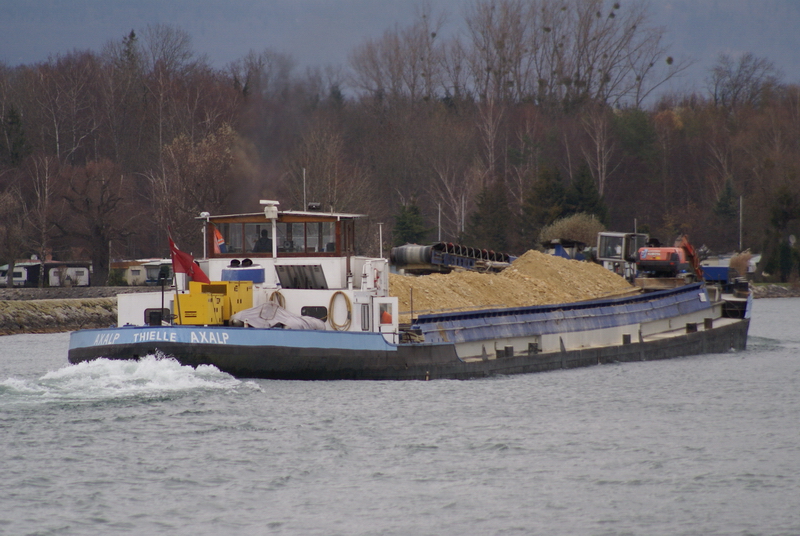 History The inland cargo vessel AXALP was constructed according to plans from the famous Swiss marine engineer Adolf J. Ryniker at the shipyard of N.V. Scheepswerfen v/h H. H. Bodewes, Millingen a/d Rijn under the hull number 422 for the Basler Rheinschiffahrt AG (BRAG), Basel. She was delivered to her owners on 11.08.1949 and registered under Swiss flag (No. of registry 427). Since 1951 an accommodation modul for passengers was installed during summer time in front of the wheel house, containing 4 double berth cabins, a galley and a living room. This modul was constructed by Gutehoffnungshütte Oberhausen A.G., Rheinwerft, Walsum, Germany and had a total weight of 13 tonnes. According to a sketch a few more passenger cabins were also located on the foreship. However this additional modul was not always used. During winter seasons the vessel was used from time to time for the company's internal training scheme for deck boys. When not in service, the moduls were stored on shore. In the year 1968 the vessel was sold to BRAGTANK and in 1969 elongated and converted into a selfunloading gravel carrier (91,0 m / 1447 mt) at the shipyard Rheinwerft Mainz-Mombach, at Mainz-Mombach, Germany and used to carry gravel in the region of Basel. In 1977 sold to Rhein Umschlag AG, Muttenz, home port Basel. Not renamed. On 04.11.1982 purchased by Fertigbeton AG, Basel, Not renamed. In the year 1998 the ship was purchased by the construction company Marti AG in Moosseedorf, near Bern for service on the Lake of Neuchatel. During this time the motorway and new railway tunnels were constructed along the the lake and a huge amount of excavation material had to be carried away. To facilitate the road transport from the Rhein river to the Aare river, the vessel had to be cut in 8 sections. For this purpose the AXALP was cut in the shipyard Schiffswerft Josef Braun GmbH & Co. KG, Speyer, Germany, first longitudinally into into a port and starboard section, then these were cut into fore, middle and aft sections, giving a total of 8 sections. These sections were brought by push barges to the Auhafen in Basel, then by road to the construction yard of the Marti AG on the Aare river at Arch, near Grenchen (see also article in BAZ). On the construction site in Arch the ship was assembled into 2 sections, the foreship and the stern part with the propulsion plant. These two sections were towed separately to the Zihl Canal (connection between the Lake Bienne and the Lake Neuchatel). Due to the insufficent length of the lock at Port, near Bienne, the ship could not be completed at Arch. In Thielle on the Zihl Canal the two sections were joined afloat, aligned and welded together (see also article from Urs Vogelbacher, published in the SVS-Journal of 6/1998) and SwissShips info on assembly. After the AXALP (Register number NE2493) was put into service again, she commenced to transport excavation material from the various building sites along Lake Neuchatel to the discharge port Thielle, in the Zihl Canal. The material was suitable for the fabrication of cement in the nearby cement works of Juracime. Since some time the vessel was loaded at the last building site in Serrière, near Neuchatel. Today, in January 2011 these large construction works are almost completed and the AXALP sails only occasionally a few days per month. If new transport requirements will come up is very doubtful. The many years of hard work have left their marks on the ship and major repairs would become necessary sometimes in the future. However such a huge ship cannot be docked on the Lake Neuchatel, nor on Lake Bienne. Therefore we assume, that the days of this remarkable ship are counted soon.