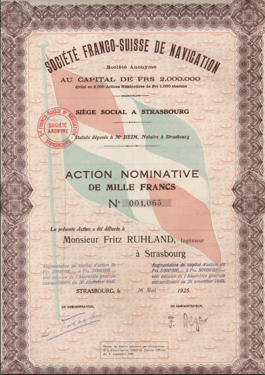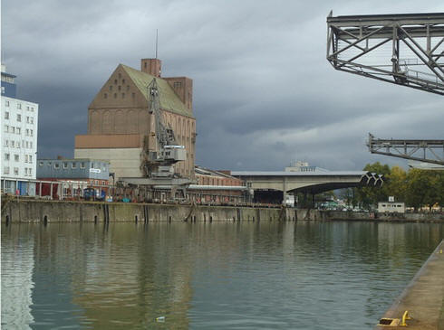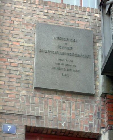 Alpina Transports et Affrètements SA Antwerpen (Photo SRAG) Die N.V. Alpina Scheepvaart Mij. in Rotterdam (Photo SRAG) In 1962 übernahmen Ernst Göhner und Dieter Bührle je 25% der Alpina Reederei, bis 1971 hatten sie ihre Beteiligung zu je 49¼ % aufgestockt. In diesen guten Zeiten besass die Reederei mehr als zehn Seeschiffe, die alle unter Schweizer Flagge fuhren. Von der Zeit nach dem zweiten Weltkrieg bis in die siebziger Jahre war der grösste Teil der Seeleute Schweizer Bürger, dann nahm ihr Anteil rapide ab. Anfangs 1987 stellte die Alpina Reederei AG, die die Seeschiffe der Schweizerischen Reederei AG betrieb, ihre Tätigkeit ein. Das Aktienkapital der Alpina gehörte je zur Hälfte der Göhner Stiftung und dem Bührle Konzern in Zürich, daher war es naheliegend, dass ihre beiden letzten, unter Schweizer Flagge fahrenden Schiffe, die kleinen Kühlschiffe BASILEA und TURICIA von Air Sea Broker AG / Panalpina im Februar 1987 in das Management übernommen wurden (Panalpina gehörte damals zu 100% zur Göhner Stiftung). Die Schiffe wurden ohne Namenwechsel unter der Flagge von Zypern registriert. Anfänglich wurde die kommerzielle und technische Betreuung von Panalpina durchgeführt, 1990 jedoch an Harmstorf Shipping Co. Ltd., Limassol übergeben. Im Jahr 1996 wurden dann diese beiden letzten Schiffe ins Ausland verkauft. 5. Umschlagplätze, Büros, Tochtergesellschaften und Niederlassungen Frühzeitig wurden auch Umschlag- und Lagereinrichtungen in den Basler Rheinhäfen gebaut. Um die Präsenz am Fluss zu stärken, wurden Tochtergesellschaften gegründet oder Verbindungen mit befreundeten Firmen eingegangen, somit war die Genossenschaft nach 5 Jahren in Strasbourg, Kehl, Mannheim, Duisburg, Rotterdam und Antwerpen vertreten. Agenturen bestanden in Dordrecht, Lobith, Emmerich und St. Goar. Diese Tochtergesellschaften besassen auch einen ansehnlichen Schiffsraum, der unter jeweiligen Flagge der Niederlande, Frankreichs, Deutschland und Belgien fuhr. Diese Firmen waren (in Klammer das Gründungsjahr): - Société Franco-Suisse de Navigation S.A. Strasbourg (1923) Aktie von der Société Franco-Suisse de Navigation S.A., Strasbourg - Nederlandsch-Zwitsersche Scheepvaart Maatschappij, Rotterdam (1924) Ab 1953 N.V. ALPINA Scheepvaart Maatschappij, Rotterdam - Les Chargeurs Belgo-Suisses S.A., Antwerpen (1929) Ab 1947 Alpina Transports et Affrétements S.A. Antwerpen - Navalsa S.à.r.l., Strasbourg (1932) - Schellen Scheepvaart & Bevrachting NV, Rotterdam (1934) (Küstenschiffahrt) - Naphta, Sociètè de Transports à.r.l., Strasbourg (1935) - Vinotra S.A., Paris (1935, mit einer 50 % Beteiligung zusammen mit Citerna S.A., Paris) (siehe auch unsere Flottenlisten und den ausführlicher Bericht aus den "Rheinquellen", 1924). - Schweizer Rheinschiffahrtsgesellschaft m.b.H., Kehl (1932) Ab 1942 Badisch-Schweizerisches Schiffahrtskontor G.m.b.H., Kehl - Rohner & Gehrig Schiffahrts-und Speditions AG, Wien - SRN ALPINA, Dornbirn & Wien Nachdem in 1922 mit dem Bau des Rheinhafens Kleinhüningen begonnen wurde, nahm die SSG im Jahr 1926 am Hafenbecken 1 den grössten und modernsten Getreidespeicher der Schweiz in Betrieb mit einem Fassungsvermögen von 11'000 Tonnen. In diesem sogenannten Bernoulli Speicher (nach seinem Architekten Hans Bernoulli benannt) wurden auch alle Reedereibüros untergebracht. Der Bernoulli Speicher mit dem Umschlaghof im Hintergrund. Diese und die untere Aufnahmen wurden an einem Samstag in 2014 gemacht, alle Schiffe haben den Hafen vor dem Wochenende verlassen und sind auf Fahrt (Photo Archiv SwissShips) Der 1926 fertig gestellte Bernoulli Speicher im Hintergrund und der 1952 gebaute Umschlaghof am inneren Ende des Hafenbecken 1, beim sogenannten "Affenfelsen" (ganz rechts das Ende des Hafenbeckens, wo die Zuschauer standen). Ganz rechts auch die Ausstellung "Verkehrsdrehscheibe Schweiz" (Photo Archiv SwissShips) Eingang zum Bernoulli Speicher von der Strassenseite mit der Gedenktafel über der Türe (Photo Archiv SwissShips)