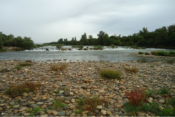 Die Isteiner Schwelle am 8. September 2011 bei Niedrigwasser. Heute fliesst der grösste Teil des Wassers durch den Rheinseitenkanal, aber eine Restwassermenge und das überschüssiges Wasser wird beim Wehr Märkt in das ursprüngliche Flussbett abgelassen. Die Isteiner Schwelle hat ungefähr ein Gefälle von 2 m (Photo Archiv SwissShips)