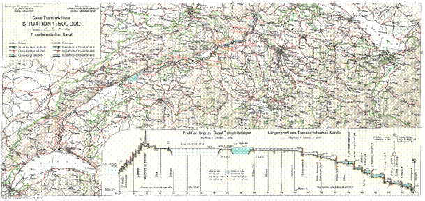 Karte des Transhelvetischen Kanals mit der steil abfallenden Schleusentreppe zwischen Neuenburger- und Genfersee