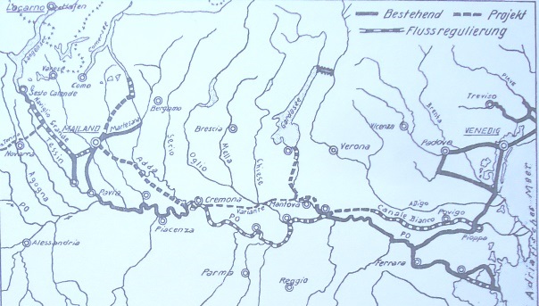 Vor dem 2. Weltkrieg wurden in Italien verschiedene Projektvarianten diskutiert, die adriatische Küste sollte über Flüsse und Kanäle mit Mailand, dem Garda-, dem Comer- und dem Langensee verbunden werden. Auch die Eidgenossenschaft wurde zum Teil in diese Pläne mit einbezogen, interessierte sich die Schweiz besonders für die Schifffahrt zum Langensee, um die Gotthard Transitlinie per Schiff weiterzuführen. In einem Hafen in der Magadinoebene hätten man die Güter auf die Binnenschiffe zur Weiterbeförderung nach Oberitalien und zu den adriatischen Seehäfen umgeladen.