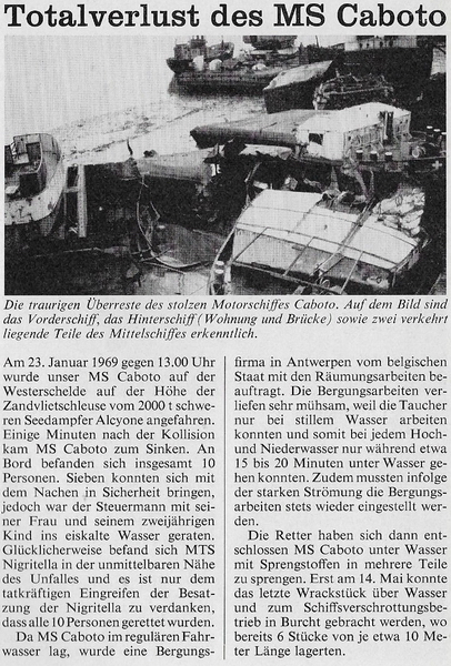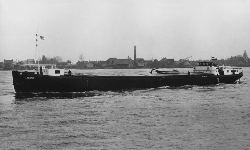 Das GMS CABOTO wurde 1959 bei Schiffswerft De Groot & Van Vliet in Slikkerveer als 4. Schiff der sogenannten "Entdecker" Klasse für die N.V. ALPINA Scheepvaart Maatschappij in Rotterdam, einer Tochtergesellschaft der Schweizerischen Reederei AG (SRAG) Basel gebaut. Am 07.03.1959 vom Stapel gelaufen. Die Ablieferung an die Eigner Gesellschaft fand am 18.04.1959 statt. Das Schiff wurde benannt nach Sebastiano Caboto ein aus Venedig stammender Entdecker und Kartograph, der im Dienst der englischen und spanischen Krone stand. Am 7. Oktober 1960 ereignete sich in Emmerich eine der bislang größten Schiffskatastrophen in der deutschen Binnenschifffahrt der Nachkriegszeit. Die dänische Hochseefähre TINA SCARLETT ist auf Überführungsfahrt von der Bauwerft in Köln nach Rotterdam zur weiteren Ausrüstung, in das vor Anker liegende mit Benzin voll abgeladene TMS DIAMANT gefahren. Durch die Kollision lief eine sehr grosse Menge Benzin aus der DIAMANT aus, die sich etwas später auf der Flussoberfläche entzündete. Insgesamt brannte es auf zehn Schiffen. Der Rhein stand auf einer Breite von rund 300 Metern in Flammen. Das Tankschiff trieb brennend mit der Fähre auf Grund und beide brannten 10 Tage weiter und ist danach teilweise gesunken. Die havarierte und total ausgebrannte Fähre sank später ebenfalls. Zwei Menschen verloren ihr Leben und 22 weitere Personen wurden zum Teil schwer verletzt. Grund für diese Havarie war ein Ruderversagen auf der Fähre, welches aufgrund einer laschen Sorgfaltsplicht an Bord ausgelöst wurde. Die CABOTO fuhr gerade in diesem Moment zu Berg als sich das im Rhein treibende Benzin plötzlich entzündete und dabei geriet die Baumwollen Decksladung und die Farbe vom Schiff in Brand, der zum Glück aber durch die Besatzung und der Feuerwehr Emmerich rasch gelöscht werden konnte. Auch die hinter der CABOTO fahrende BELLINZONA der BRAG wurde in Mitleidenschaft gezogen und erlitt Brandschäden. Bericht vom Schiffsführer E. Kronenberg Betroffen waren insgesamt elf Schiffe die mehr oder weniger vom Havarie Ereignis in Mitleidenschaft gezogen wurden. Es handelte sich dabei um die Hochseefähre "Tina Scarlett", die Tankmotorschiffe "Diamant", "Brigitte" und "Vinkeveen", die Motorschiffe "Vaarwel II", "Fortuna", "Hean", "Caboto", "Bellinzona", "Virgo Fidelis II" und "Liberte". Auf der Fahrt von Antwerpen nach Basel mit 970 Tonnen Stückgut am 23.01.1969 auf der Westerschelde bei der Zandvliet Schleuse von dem Deutschen Seeschiff ALCYONE (Argo Reederei Richard Adler & Söhne, Bremen) Mittschiffs überfahren und so schwer beschädigt, dass die CABOTO im Hauptfahrwasser in 2 Teile zerbrach und in der Schelde sank. Die Besatzung unter dem Kommando von Ewout Kronenburg, der belgische Lotse und Gäste an Bord, insgesamt 10 Personen, konnten sich glücklicherweise retten. Die schuldige ALCYONE fuhr ohne sich um die Schiffbrüchigen zu kümmern einfach weiter. Zum Glück war das TMS NIGRITELLA in der Nähe und konnte alle Leute retten. Das Schiff wurde als Totalverlust deklariert und 1970 nach der Bergung der Wrackteile in Burcht verschrottet. Man munkelte damals auf dem Rhein unter Schiffern, dass die Hauptmaschine schon vor der Bergung des Achterschiffes verschwand. Ob das allerdings stimmt, oder bloss Schiffergarn ist, bleibt dahingestellt. Niederländische Berichte: De "Caboto" van 970 ton werd op 23 januari 1969 ter hoogte van Zandvliet aangevaren door de Duitse zeeboot "Alcyone". Het was slecht zicht en de "Alcyone" voer met ca. 25 km/uur. Hij raakte de "Caboto" midscheeps en voer het schip finaal in tweeën wat vervolgens in twee stukken brak en achter de Alcyone begon te zinken. Ewout Kronenburg en zijn bemanning kwamen er goed af. Dat was wel een wonder want er waren maar liefst tien mensen aan boord: de schipper met zijn vrouw en dochter, de stuurman met vrouw en kind, 3 bemanningsleden en een Belgische loods. Met behulp van de roeiboot en vanaf de toegeschoten tanker "Nigritella" (1250 ton) werden de drenkelingen gered. De "Alcyone" voer gewoon door.