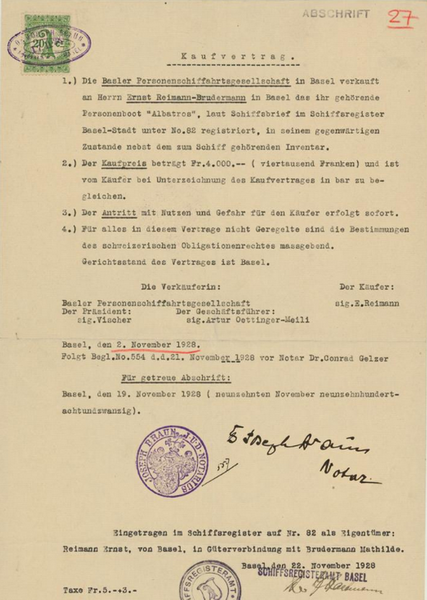 1917 gebaut bei der Bremer Rolandwerft für ? 19..: Eigner Elektrizitätswerk Basel. Stationiert beim Kraftwerk Augst für den Einsatz als Werkboot und Tal Schlepper. Im Juni 1926 angekauft durch die Basler Personenschiffahrtsgesellschaft (BPSG) für 7'000 Schweizer Franken, welche aus der Initiative von Ing. Rudolf Gelpke und dem "Verein für die Schiffahrt auf dem Oberrhein" 1924 gegründet wurde. Die ALBATROS, die mit einem Benzinmotor ausgerüstet war, wurde als Einsatz und Reserveboot für Fahrgastfahrten von Basel nach Rheinfelden und zurück eingesetzt. Um 50 Tagesfahrgäste mitzunehmen wurde das Boot für 5'000 Sfr. von Schiffbau Ing. C. Scheller umgebaut. Im Jahre 1928 stellte die Basler Personenschiffahrts-Gesellschaft ihren Betrieb ein, da die BRAG ebenfalls einen Passagierdienst der zu billigeren Tarifen die Fahrgastfahrten anbot. Die ALBATROS wurde am 21. November 1928 durch Ernst Reimann für Sfr 4'000 gekauft und als Eigner Reimann Ernst von Basel, in Güterverbindung mit Brudermann Mathilde, im Schiffsregister eingetragen. 1929 aus dem Basler Schiffsregister gestrichen. Verbleib unbekannt.