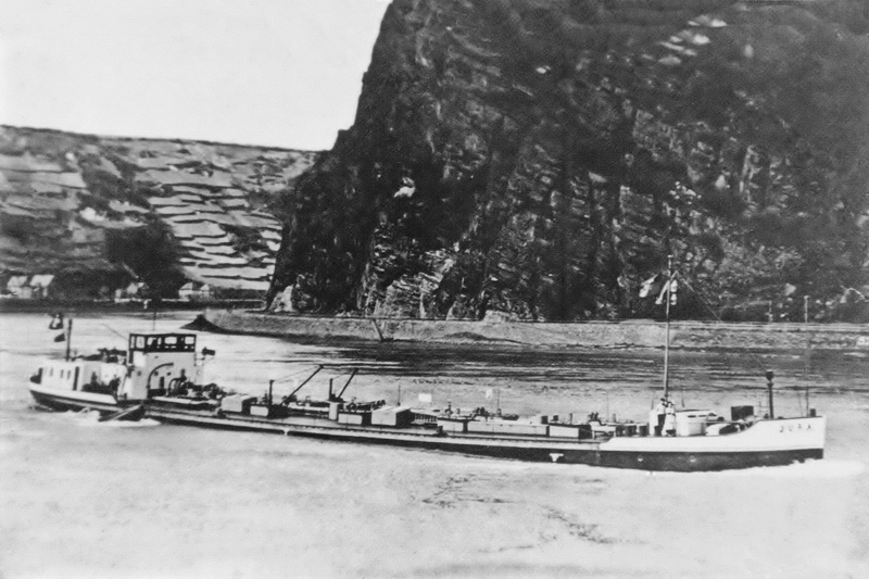Gebaut 1936/37 bei der belgischen Schiffswerft Jos. Boel & Zonen Scheepsbowwerf Temsche / Jos. Boel & Fils Chantiers Navals, Tamise (Bau Nr.: 912) als JURA für die Schweizer Reederei Citerna A.G., Basel die zum belgischen Plouvier Konzern gehörte. Möglicherweise waren aber auch Louis Groschupf oder Leute von der BRAG an Citerna AG mitbeteiligt, darum auch die Schweizer Berg- oder Passnamen, die sonst bei der Lloyd AG üblich waren. Eine Baugleiche Schwester mit dem Namen SIMPLON kam im März 1937 in Fahrt. In Gebrüder Sulzer Unterlagen findet sich der Hinweis bei den Zylinder Nummern 17287-91 / Verkaufs Nr.: 757199, dass die Hauptmaschine dieses Tankers vom Typ 5 RKS 30 auf 5 RKWP 30 umgebaut wurde. Der Überfall der deutschen Wehrmacht auf die Niederlande, Belgien und Luxemburg im Zweiten Weltkrieg begann am 10. Mai 1940 und kurz nachdem deutsche Flugzeuge Magnetminen vor dem Hafen von Zeebrugge abgeworfen hatten, traf der mit Benzin beladene Schweizer Tanker JURA eine von ihnen und wurde am 12. Mai 1940 in Brand gesteckt. MTS JURA war nur 1 Seemeile vom Hafen entfernt. Die Ehefrau des Kapitäns und der Lotse starben in den Flammen, während der Schiffsführer Jules Van De Putte durch einen Sprung ins brennende Meer und schwimmen unter Wasser entkommen und von der Besatzung eines in der Nähe fahrenden Schleppers geborgen wurde. Über das Schicksal der weiteren Besatzungsmitglieder sind keine Angaben vorhanden. In den Sulzer Unterlagen findet sich die Handschriftliche Notiz "Untergang 17.1.41". Schiffmann Jules Van De Putte kommandierte später viele Jahre das TMS PORZANA von der Tankschiff A.G., Basel. TMS JURA wurde als Totalverlust am 17.02.1942 aus dem Schweizer Rheinschiffsregister gestrichen. |