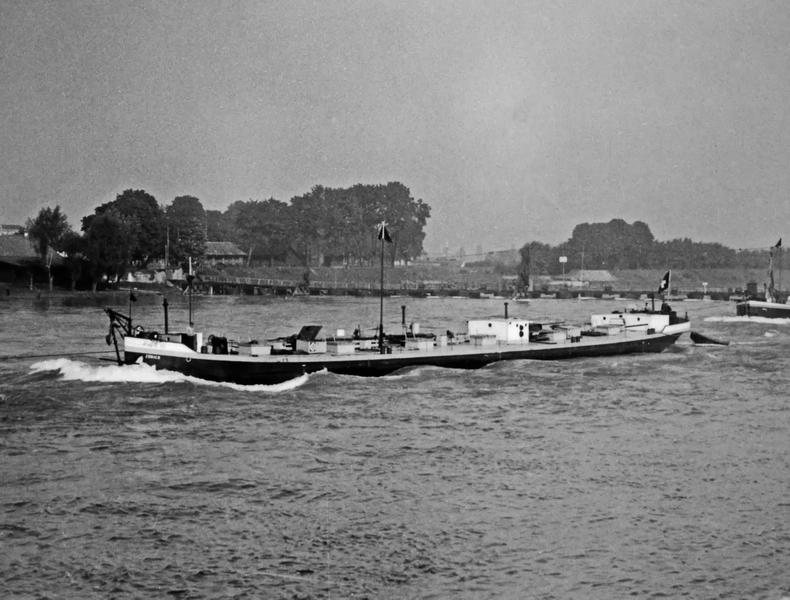 RTS PICO III im Anhang von der französischen Räderboot BREST unterhalb von Basel im Herbst 1926 bei der 1. Reise in die Schweiz / RTS PICO III in tow of the French sidewheel steamtug BREST below Basel in autumn 1926 during the 1st trip to Switzerland