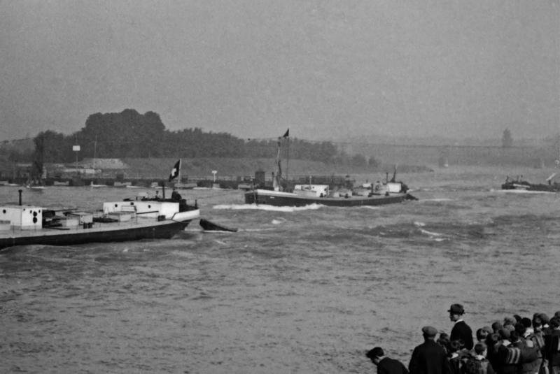 Erste Ankunft von RTS PICO IV im Anhang der französischen Räderboot BREST in Basel im Herbst 1926. Das Schiff hatte gerade die Schiffbrücke Hüningen passiert / First arrival of RTS PICO IV in tow of the French paddle steamer BREST in Basel in autumn 1926. The ship had just passed the Hüningen ship bridge