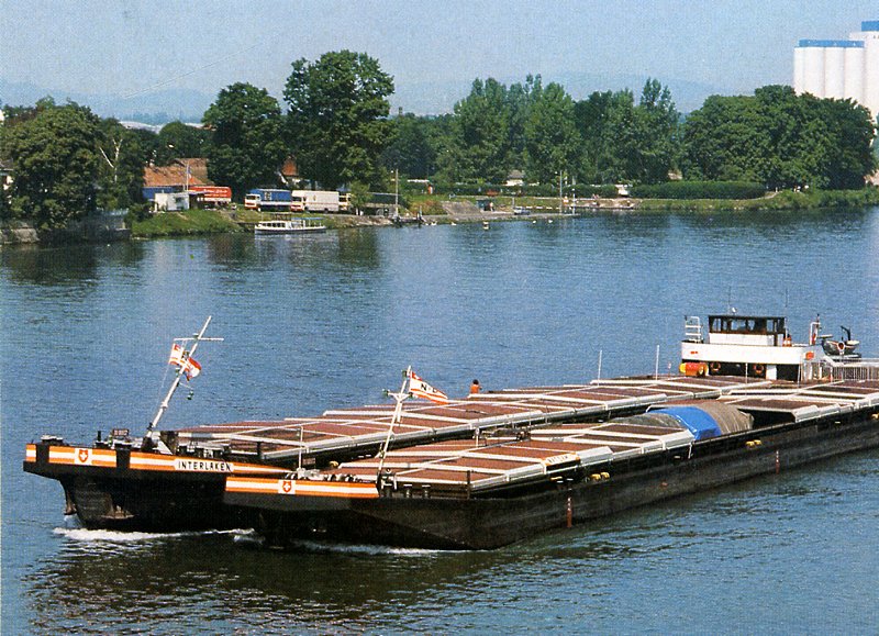 Schubgütermotorschiff INTERLAKEN mit auf Seit gekoppelten Schubleichter NATDAM 1 in Basel beim Dreiländereck