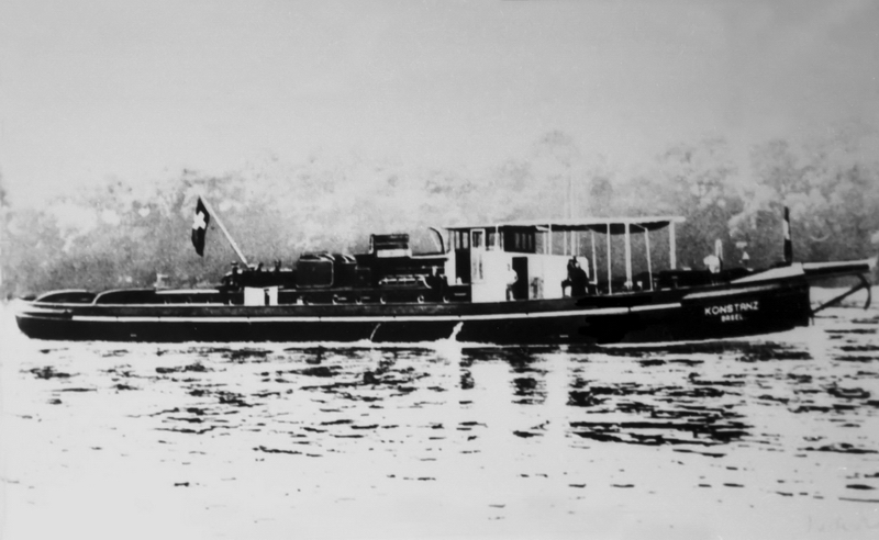 Boot KONSTANZ oberhalb der Schleuse Augst auf der Fahrt nach Badisch-Rheinfelden mit Rheinschiff BADEN 230 im Schlepp am 22. Juni 1933 / Tugboat KONSTANZ above the Augst lock on the way to Badisch-Rheinfelden with Rhine barge BADEN 230 in tow on 22 June 1933