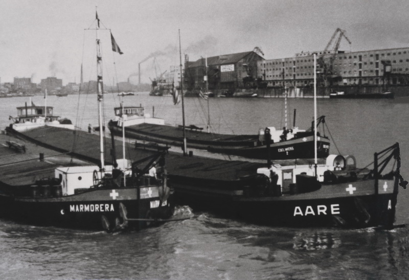 1915 gebaut bei Scheepswerfen A. Vuyk & Zonen, Capelle an den Ijssel (Bau Nr.: 437) und im September 1915 als ELLA an J. Heck in Antwerpen abgeliefert. (78.00x9.40x2.50 - 1'304 Tonnen Tragfähigkeit). Laut SSG Angaben heisst der Erbauer "De Waal" Nijmegen im Auftrag von Firma Vuyk, Rotterdam. 191? Verkauft in die Niederlande an ?, neuer Name INTERNATIONALE 58. Eingebrannte Nummer 557. 1919 Angekauft durch die Schweizer Schleppschiffahrtsgenossenschaft (SSG) Basel. Umbenannt in AARE. Am 21.05.1924 wurde das Offizielle Schweizer Rheinschiffsregister etabliert und die AARE erhielt die Register Nummer 20. Ab dem 24.06.1938 hiess der Eigner nun Schweizerische Reederei AG (SRAG) Basel. Im Dezember 1961 übertragen an die neu gegründete Edelweiss Reederei AG Basel, eine Tochtergesellschaft der Schweizerischen Reederei AG (SRAG) Basel. Ab 26.05.1962 als GMS in Fahrt, neu vermessen mit 1'268 Tonnen Tragfähigkeit / 285 Ps (Deutz Diesel Baujahr 1939). Umgebaut bei Gutehoffnungshütte Sterkrade A.G., Rheinwerft, Walsum. Eingesetzt in der Kiesfahrt zwischen Wyhlen (Baden-W.) und dem Au Hafen Muttenz Basel Landschaft. 1968 transferiert an die Schweizerische Reederei AG (SRAG) Basel. Am 23.06.1975 wird der Eignername in Schweizerische Reederei und Neptun AG (SRN) Basel geändert, nach der Fusion mit der NEPTUN Transport- & Schiffahrts AG Basel. 01.01.1976 IVR Nr.: 7000020. 12.02.1976 verkauft an O. Slokkers, Ridderkerk und umbenannt in ASTRID. IVR Nr.: 2314439 1976 weiterverkauft D.B. Versluis in Werkendam. Neuer Name QUO VADIS. 1977 Ankauf durch M. Hoogendoorn in Werkendam und umbenannt in RES NOVA. 1978 und neu motorisiert mit einem 608 Ps starken Detroit Dieselmotor. 1994 Ankauf durch G. Hovestadt in Werkendam neuer Name SAYONARA 1997 verkauft an D. Visser in Sneek und umbenannt in DOUWE HENDRIK. 2006 an G. Knol in Maasbracht neuer Name COMRADE. Neue Ladesektion & Vorschiff mit den Abmessungen von 85.98 x 9.50 x 3.00 mit dem alten, jedoch schon früher modernisierten Achterschiff verbunden und ist nun als Sandfrachter (Beunship) mit 1'605 Tonnen Tragfähigkeit in Fahrt. 2007 ENI Nr.: 02314439.
