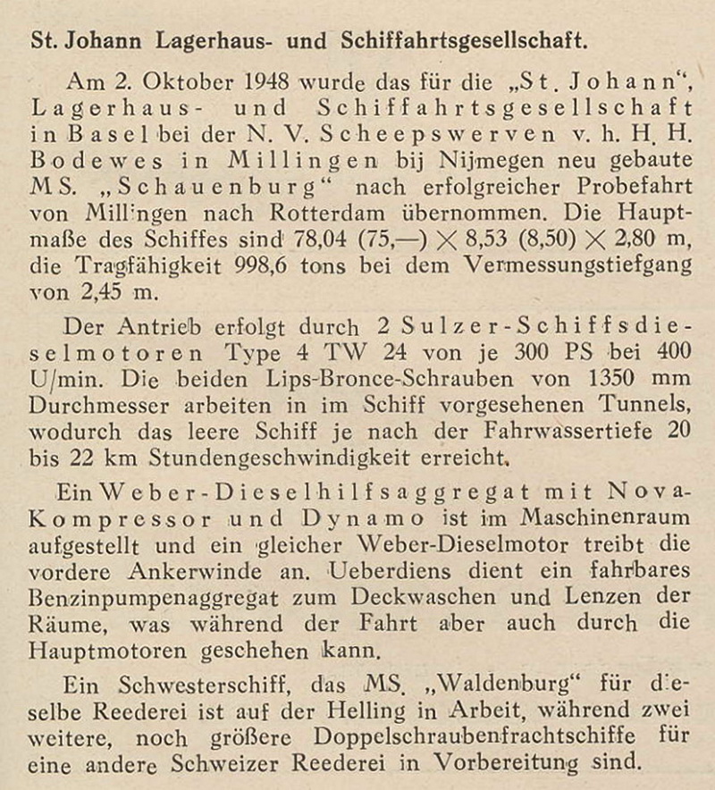 | Tech. Management / Technical Mgmt: | "St. Johann" Lagerhaus- und Schiffahrtsgesellschaft, Basel | ||