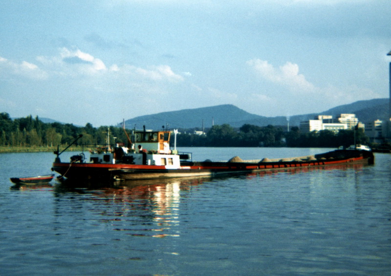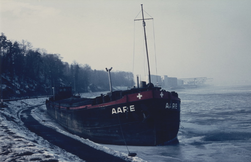 Die AARE beladen mit Kies aus dem rechtsrheinischen (badischen) Wyhlen wartet für die nächtliche Löschung zwischen 21:00 und 05:00 Uhr beim Au Hafen Muttenz, nach den regulären Lade & Löschzeiten von den Rheinhäfen beider Basel