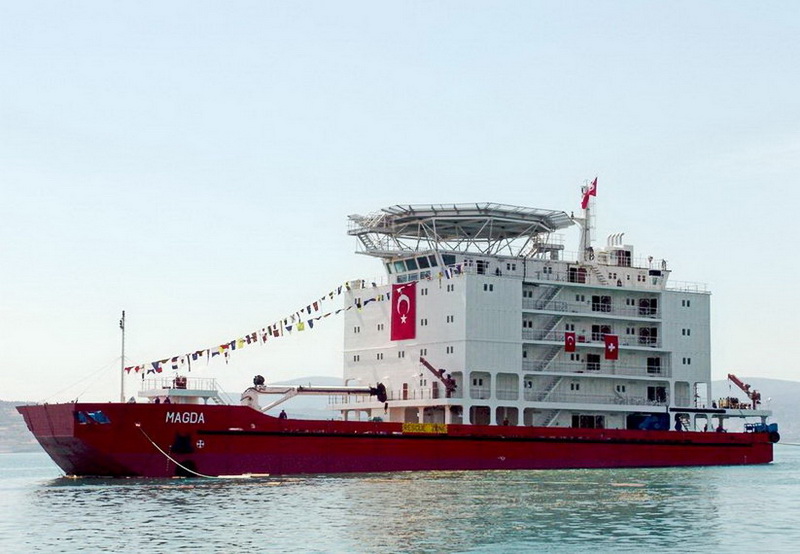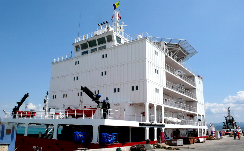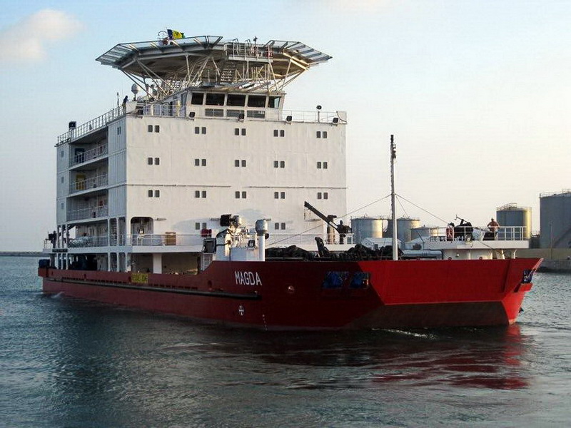 Il pontone MAGDA (Accomodation Barge-Hotel Barge) viene costruito preso il cantiere Gelibolu Shipyard S.A., Gelibolu, Turchia , con il numero di costruzione 042. È provvisto di propulsore proprio. È la terza costruzione di una serie di 3 unità (le prime due sono ELISA e RIO DEL REY). Il taglio delle prime lamiere avviene il 26-06-2008 ed il varo viene effettuato il 06-06-2009. La supervisione della costruzione avviene tramite esperti della ABC Maritime. Il pontone viene battezzato MAGDA, ed il 30-07-2009 messo sotto bandiera di St.VinBcent and The Grenadines (IMO nr.: 9480693, numero matricola: 10632, nominative internazionale: J8B4159). Il supporto commerciale e tecnico lo svolge la ABC Maritime, Nyon. Il 10-08-2009, il pontone parte dal cantiere, da dove intraprende il viaggio per Douala, Kamerun. Sosta per breve tempo a Gibilterra. Le dimensioni sono le seguenti: Lunghezza: 70 m, larghezza 20 m, altezza 4,3 m, pescaggio a pieno carico 2,3 m. Disloca 2162 tonn., e la portata è di 866 tonn. Una piattaforma per elicotteri ed alloggi più grandi distinguono il pontone dall’altro pontone nominato ELISA. Equippaggiato con un propulsore Diesel-Ellettrico, il quale aziona 2 eliche azimutali, installate a poppa (eliche orientabili, rendono superfluo il sistema di governo tradizionale, macchina del timone e timone), costruite dalla Schottel, Germania, con una Potenza di 525 kW ciascuna. Un’elica di manovra da 270 kW supporta le manovre. Quattro generatori Diesel, costruiti dalla Moteurs Bauduoin, Marsiglia, tipo M26SR, producono la necessaria alimentazione ellettrica (A.C. 3 fasi, 400/230V,50Hz) per i motori di propulsione ed i servizi ausiliari come anche per gli impianti necessari del servizio alberghiero. Ogni gruppo ha una capacità di 571kW. Il pontone è provvisto di un sistema di ancoraggio “8-point mooring”, cioè, sono installate 2 ancore Flipper-Delta, accoppiate ad un cavo d’acciao da 38mm, a prua ed a poppa, a dritta e sinistra. I cavi hanno una lunghezza di 1600m ed un peso di 9 tonn. Una gru da 10 tonn. è installata a dritta sul ponte di lavoro. Gli alloggi sono predisposti per 132 persone, incluso l’equipaggio (Marine Crew) ed il personale alberghiero. Il personale per il reparto marittimo (Marine Crew) è composto da 12 persone, a secondo le esigenze a bordo. Il 14-09-2009, dopo l’arrivo a Douala ed una breve rimanenza nel porto per i preparative per la messa in servizio, il pontone perte verso i pozzi petroliferi antistante la costa del Kamerun, dove poi svolge il suo servizio. Il pontone MAGDA (Accomodation Barge-Hotel Barge) viene costruito preso il cantiere Gelibolu Shipyard S.A., Gelibolu, Turchia , con il numero di costruzione 042. È provvisto di propulsore proprio. È la terza costruzione di una serie di 3 unità (le prime due sono ELISA e RIO DEL REY). Il taglio delle prime lamiere avviene il 26-06-2008 ed il varo viene effettuato il 06-06-2009. La supervisione della costruzione avviene tramite esperti della ABC Maritime. Il pontone viene battezzato MAGDA, ed il 30-07-2009 messo sotto bandiera di St.VinBcent and The Grenadines (IMO nr.: 9480693, numero matricola: 10632, nominative internazionale: J8B4159). Il supporto commerciale e tecnico lo svolge la ABC Maritime, Nyon. Il 10-08-2009, il pontone parte dal cantiere, da dove intraprende il viaggio per Douala, Kamerun. Sosta per breve tempo a Gibilterra. Le dimensioni sono le seguenti: Lunghezza: 70 m, larghezza 20 m, altezza 4,3 m, pescaggio a pieno carico 2,3 m. Disloca 2162 tonn., e la portata è di 866 tonn. Una piattaforma per elicotteri ed alloggi più grandi distinguono il pontone dall’altro pontone nominato ELISA. Equippaggiato con un propulsore Diesel-Ellettrico, il quale aziona 2 eliche azimutali, installate a poppa (eliche orientabili, rendono superfluo il sistema di governo tradizionale, macchina del timone e timone), costruite dalla Schottel, Germania, con una Potenza di 525 kW ciascuna. Un’elica di manovra da 270 kW supporta le manovre. Quattro generatori Diesel, costruiti dalla Moteurs Bauduoin, Marsiglia, tipo M26SR, producono la necessaria alimentazione ellettrica (A.C. 3 fasi, 400/230V,50Hz) per i motori di propulsione ed i servizi ausiliari come anche per gli impianti necessari del servizio alberghiero. Ogni gruppo ha una capacità di 571kW. Il pontone è provvisto di un sistema di ancoraggio “8-point mooring”, cioè, sono installate 2 ancore Flipper-Delta, accoppiate ad un cavo d’acciao da 38mm, a prua ed a poppa, a dritta e sinistra. I cavi hanno una lunghezza di 1600m ed un peso di 9 tonn. Una gru da 10 tonn. è installata a dritta sul ponte di lavoro. Gli alloggi sono predisposti per 132 persone, incluso l’equipaggio (Marine Crew) ed il personale alberghiero. Il personale per il reparto marittimo (Marine Crew) è composto da 12 persone, a secondo le esigenze a bordo. Il 14-09-2009, dopo l’arrivo a Douala ed una breve rimanenza nel porto per i preparative per la messa in servizio, il pontone perte verso i pozzi petroliferi antistante la costa del Kamerun, dove poi svolge il suo servizio. Il 13-08-2020 messa sotto bandiera delle Isole Marshall. Nominativo internazionale: V7A4267, MMSI: 538009066. Il 11-09-2025 passa alla Dermor Inc. Co, Kingstown – St Vincent and the Grenadines e rinominata SIRONA. Nominativo internazionale: J8B6652, MMSI: 37588000. La gestione commerciale e tecnica ora la svolge la Dixstone Netherlands NV, Hoofdrop. Fonti:
