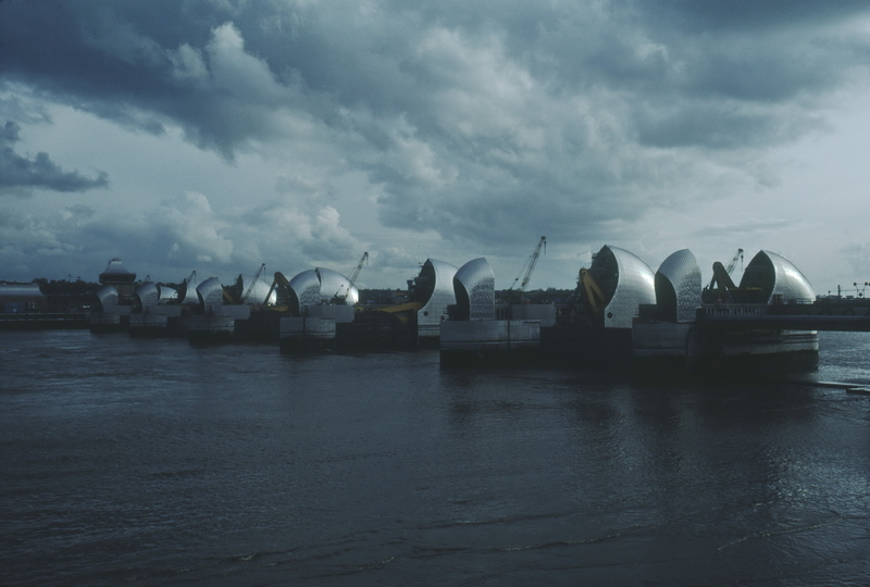 Auf der Themse beim Londoner Stadtteil Woolwich mit dem Sturmflutsperrwerk Thames Barrier / On the Thames near Woolwich, London, with the Thames Barrier storm surge barrier