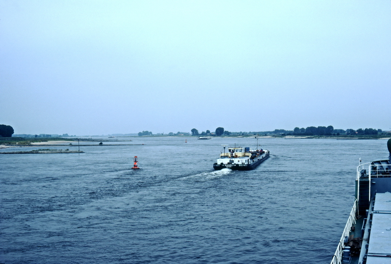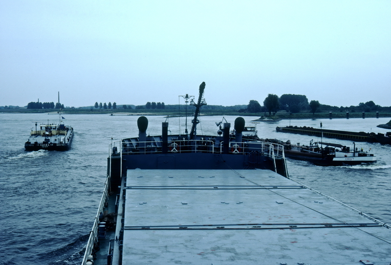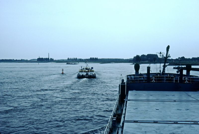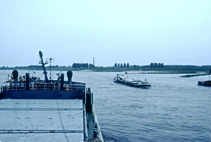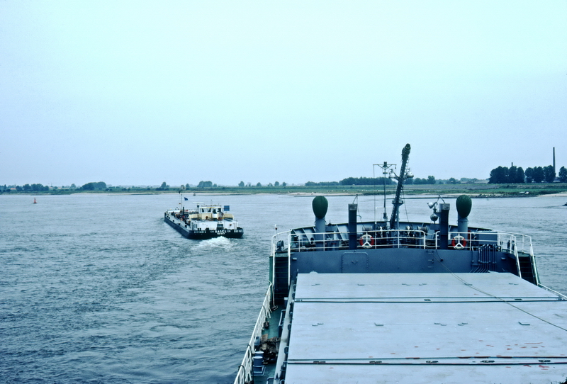 Auf dem Waal zu Berg nach Duisburg-Ruhrort mit dem DDR GMS HAVELBERG als talfahrendem Entgegenkommer / Up the Waal to Duisburg-Ruhrort with the GDR GMS HAVELBERG coming down the River