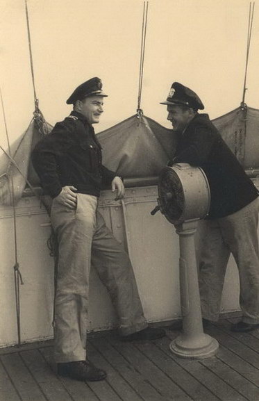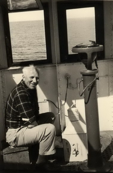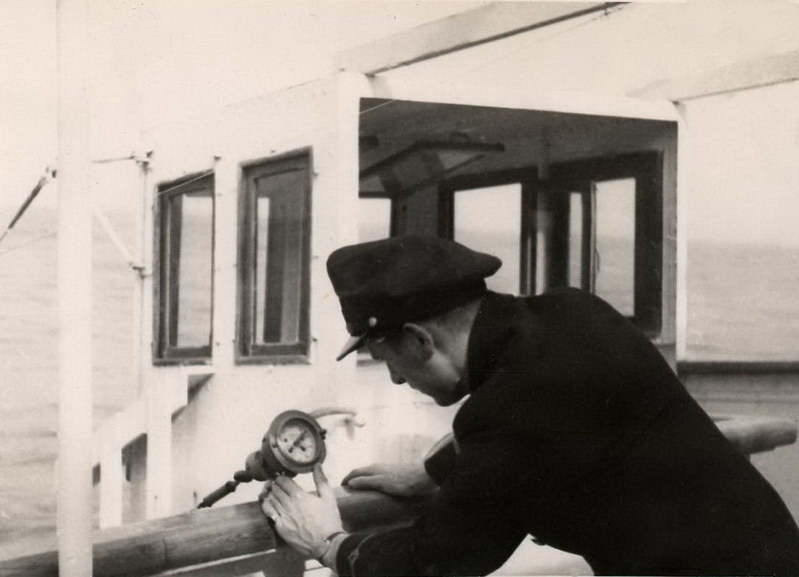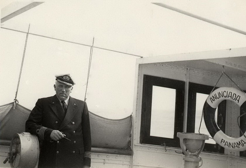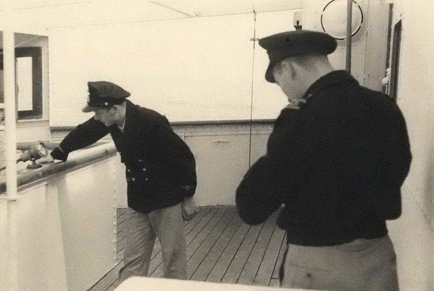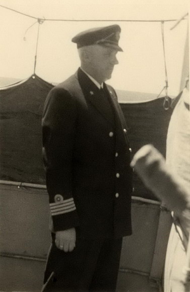 Der "Alte" Kapt. K. Heeres auf der Steuerbord Brücken Nock / The ‘old man’ Captain K. Heeres on the starboard bridge wing