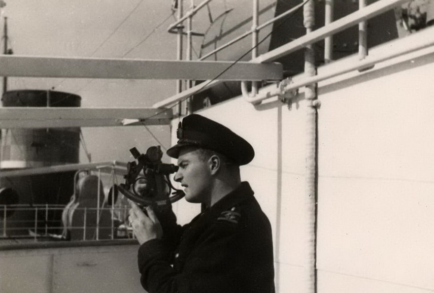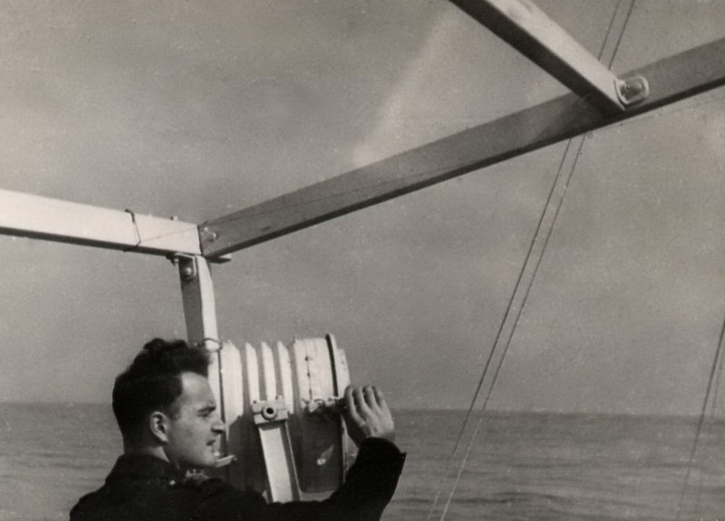 Offizier J. Voirol beim "Sonne schiessen" für das "Mittagsbesteck" / Officer J. Voirol "shooting at the sun" for the noon position calculation