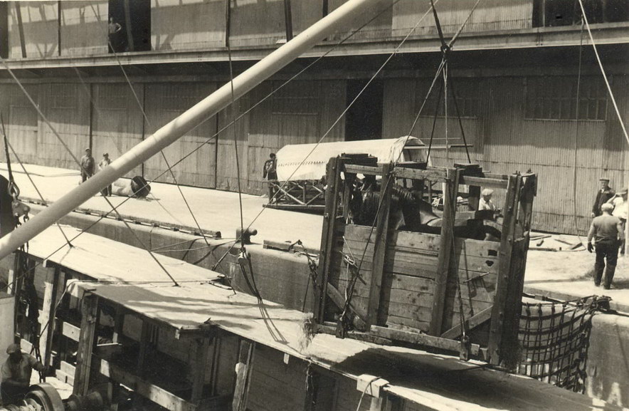 Beim Getreide löschen in einem eurpäischen Hafen im Jahr 1949 / Unloading grain at a European port in 1949