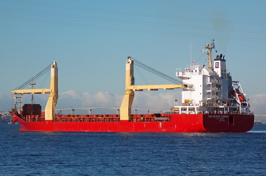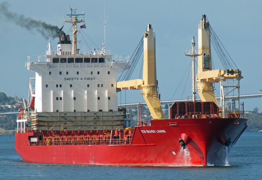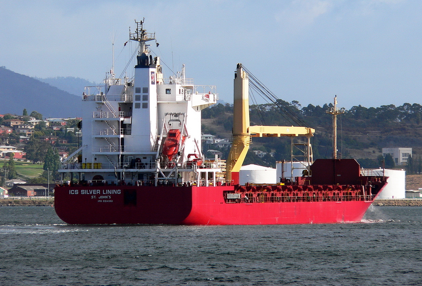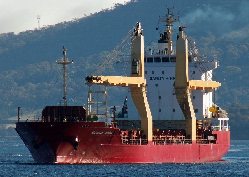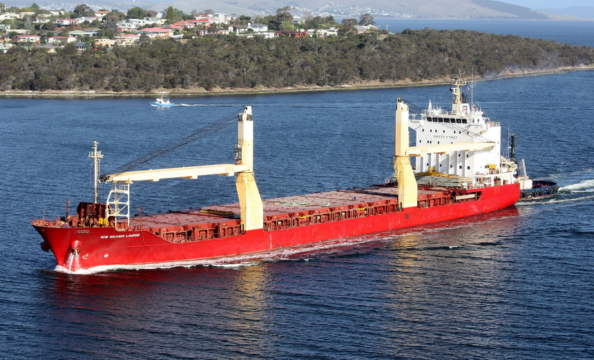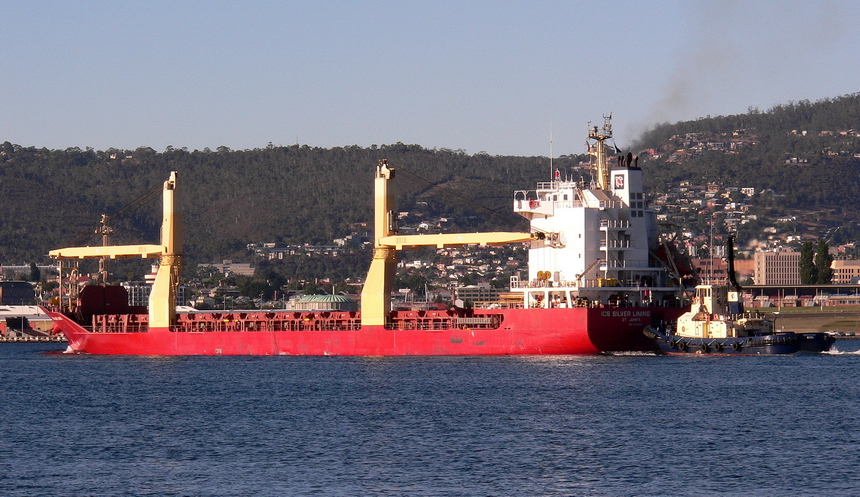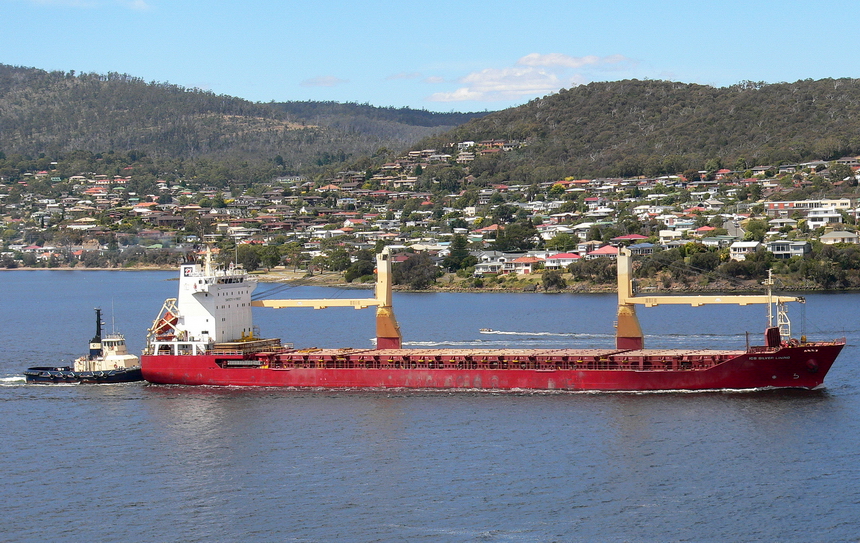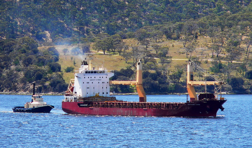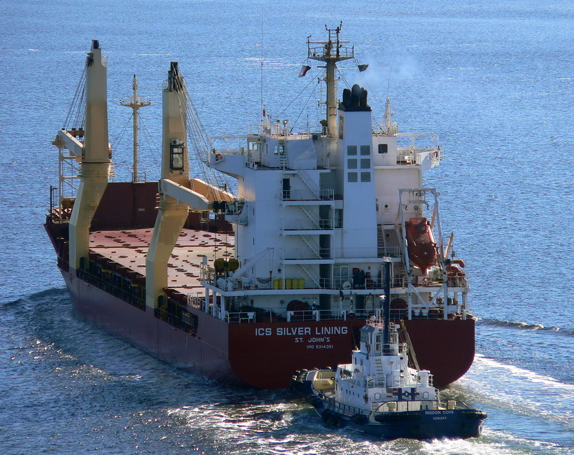 ICS SILVER LINING, with the tug WATAGAN astern, departing Hobart, Tasmania, Australia, on Saturday, 11 January 2014