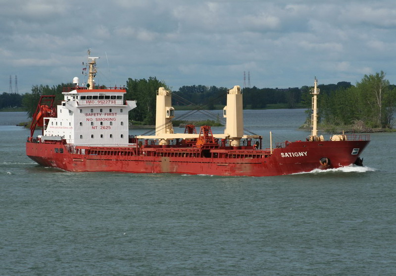 Ce navire a été commandé le 1 février 2006 au chantier naval Universe Shipbuilding (Yangzhou) Co. Ltd., Yizheng, province de Jiangsu avec le no de coque 06-006 et no. IMO 9522738, pour le compte de la Guan Yu Shipping HK Co. Ltd., à Hong Kong. Il devait être enregistré sous le nom de HUAN QIU 6 (Universe 6), avec enregistrement à Basseterre, sous pavillon de St Kitts & Nevis. Le navire a été terminé de construction en 2008 comme HUAN QIU 6 et livré le 15-01-2009 à la Massatlantic (Malta) Ltd. (gestion : Massoel Meridian Ltd., Genève), enregistré à la Valette. Apparaux de levage : 2 grues d’une capacité de 25 tonnes SWL (Safe Working Load). No officiel : 11706. Indicatif d’appel : 9HVQ9. MMSI : 249601000. Ce navire porte le nom de la Commune genevoise de Satigny, une des plus grandes régions viticoles de Suisse, qui produit des excellents vins. En avril 2013, la gestion technique est transférée à la V.Ships USA LLC, Middleton, Massachusetts. Depuis le 10 octobre 2014, la gestion technique est assurée par la V.Ships UK Ltd., Glasgow. La gestion technique a été transférée le 5 mars 2015 à Beyaz Denizcilik Ltd Sti à Istanbul. Le 24 juin 2015, affrètement coque nue à la Bright Denizcilik ve Gemi Isletmeciligi AS, Istanbul, et immatriculation à Majuro, dans les Îles Marshall. Nouveau nom : NAVIN HAWK. N° officiel : 90484. Indicatif d'appel : V7LK6. MMSI : 538090484. À partir du 18 avril 2018, le navire est enregistré pour la Nordic Gale Navigation Ltd., Majuro. Gestion : Bright Denizcilik ve Gemi Isletmeciligi AS, Istanbul. Le matin du 23 février 2021, le vraquier NAVIN HAWK, 5087 GT (IMO : 9522738), immatriculé sous pavillon des Îles Marshall, s'est échoué près de Nakskov, en provenance Dordrecht. L'accident s'est produit alors que le navire naviguait à vitesse réduite, dans de mauvaises conditions de visibilité. Le navire a accosté au poste d'amarrage n° 13 à 08h30. Les autorités maritimes danoises ont enquêté sur l'accident. Acheté le 24-12-2025 par la Grona Shipping BV, Rotterdam, le navire est enregistré sous le nouveau nom GRONA HAWK pour la société propriétaire, la Grona Hawk BV de Majuro, dans les Îles Marshall. La gestion est désormais assurée par la Grona Chartering BV à Rotterdam. L'indicatif d'appel, le MMSI et le numéro d'enregistrement officiel restent inchangés. Traduction: Pierre-André Reymond (PAR) / 2026Sources :
