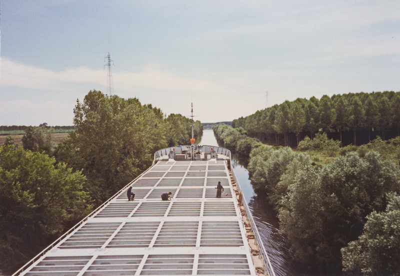 Auf dem sehr engen Banduzzi Kanal auslaufend Torviscosa (Udine) in Italien am 18. Juli 1989 / On the very narrow Banduzzi Canal leaving Torviscosa (Udine) in Italy on 18 July 1989