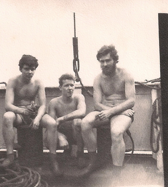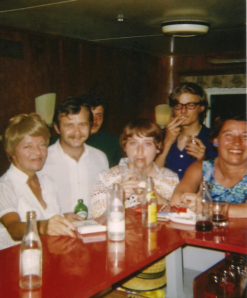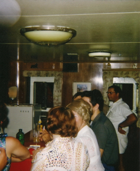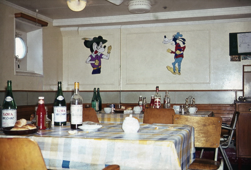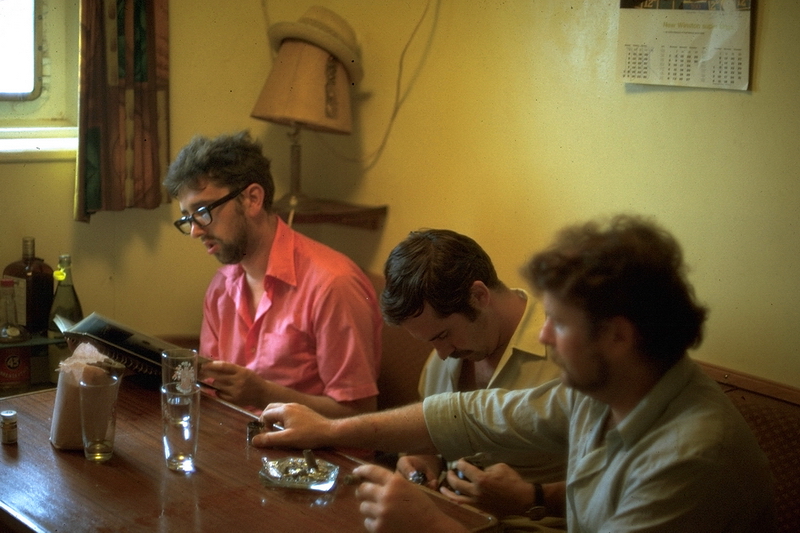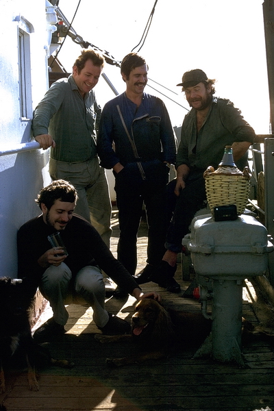 H. R. Reist, Wisser K. Kleinpeter, Chippy Russenberger, C. Bucher Bootsmann. Freetown, 20. Juli 1968, kleines Képi-Fest in der Matrosenmesse...um 23:15