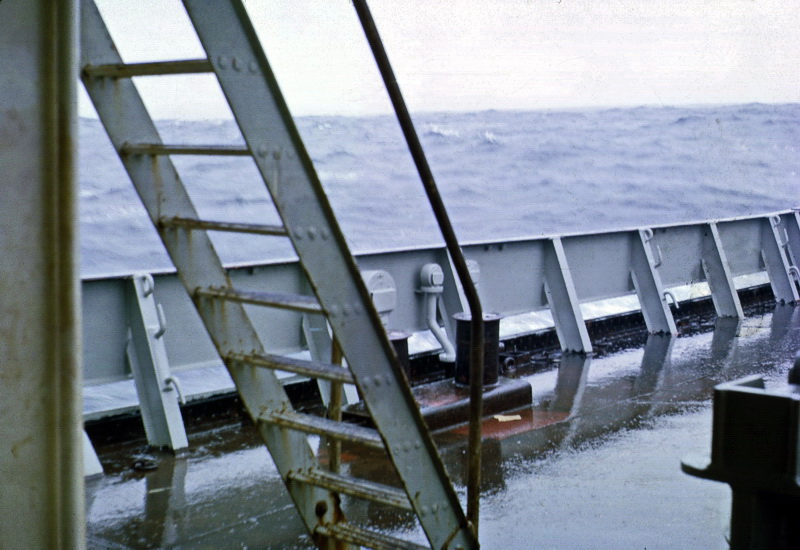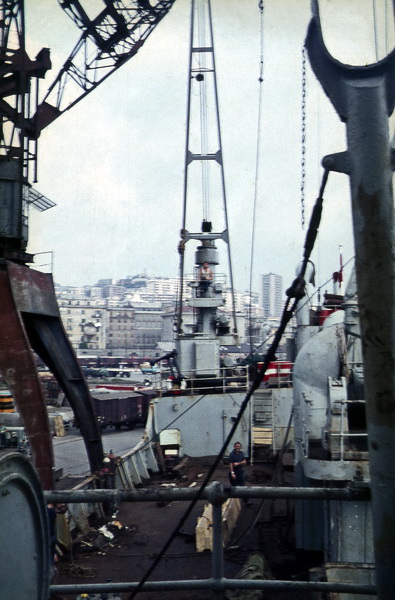 Holz Decksladung auf der AROLLA. Einer der beiden 3-Tonnen Bordkräne die bei den Deutschen als unreparierbar galten, aber von den Schweizer Bordelektrikern wieder benutzbar gemacht wurden