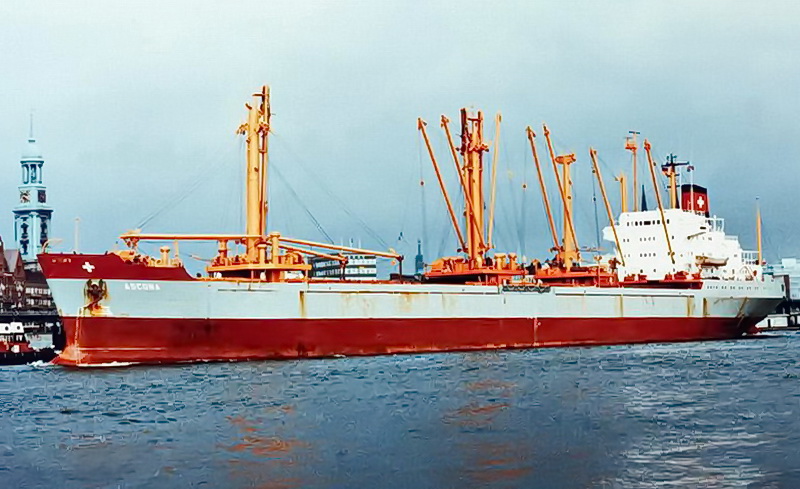 Keel laid on 7 August 1970 at Rickmers Rhederei GmbH, Rickmers Werft, Bremerhaven (construction no. 360). Launched on 25.01.1971 at 12:00 noon and christened ASCONA by Mrs. Hortense Anda-Bührle. Also present were Dr. Dieter Bührle, National Councillor A. Schaller, Chairman of the Board of Alpina Reederei, Dr. R. Bär, Director of the SSA (Swiss Maritime Navigation Office), Dr. O. Rist, Swiss Consul General in Hamburg, Mr. G. Rampazzi, Deputy Mayor of Ascona in Ticino and Captain Domingo Bücheler. Afterwards, the shipyard hosted a christening banquet at the Nordseehotel Naber in the centre of Bremerhaven. On 22.04.1971, a beautiful, sunny day, the ASCONA was handed over to her owners, Alpina Reederei AG, Basel, at the Columbuskaje near the overseas railway station in Bremerhaven and the Swiss flag was hoisted (official No.: 85, call sign: HBLC). The first master was Captain Domingo Bücheler from Kloten, Zurich. This "German multipurpose freighter", also known as the "German Liberty", was suitable for general cargo, bulk cargo and containers, see also our ship description for the ALPINA. Like her sister ship, she was specially designed for Rickmers Rhederei's China trade. For Messageries Maritimes, Paris, the first voyage took her around South Africa to Mauritius and La Réunion and back to Europe. Then the ASCONA went on-hire on a time-charter for Rickmers-Line to the Far East, which lasted about 3 years. Several voyages for Vaasa-Line from Helsinki to the west coast of Canada, USA and Central America followed. In February 1972, the ASCONA had to load 4 diesel-electric locomotives in Hamburg for the People's Republic of China. Two with a floating crane and two with the ship's cargo gear, as good practice for unloading in Hsingkang, which had to be done with the on-board equipment. The dimensions of one locomotive were 23.5 x 3.08 x 4.57 m and it weighed 126.5 tonnes (slightly more, then allowed).