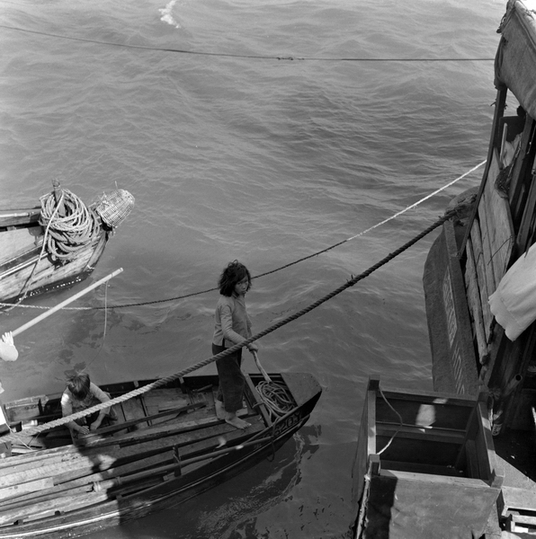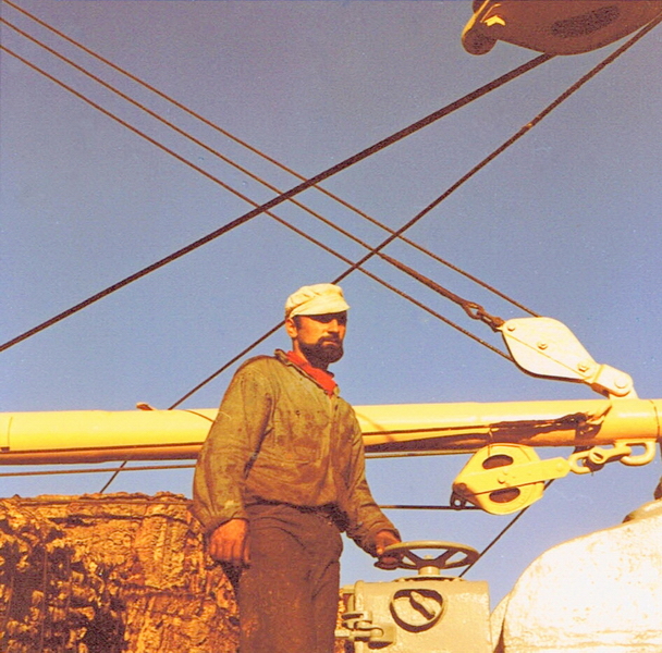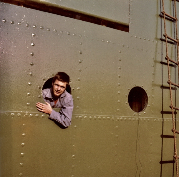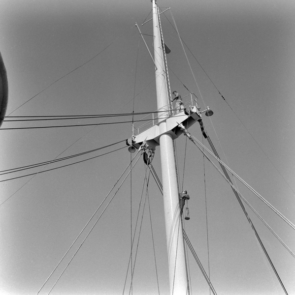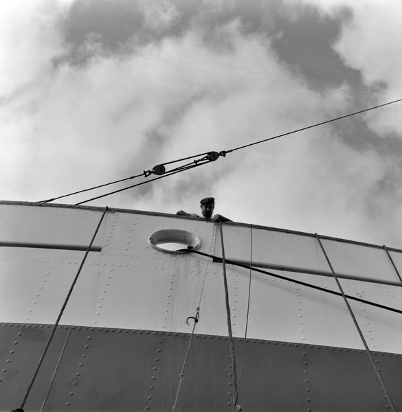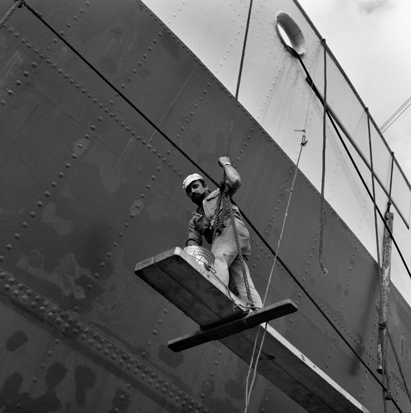 Matrose Stalder auf der Stellage bei Malerarbeit Aussenbords