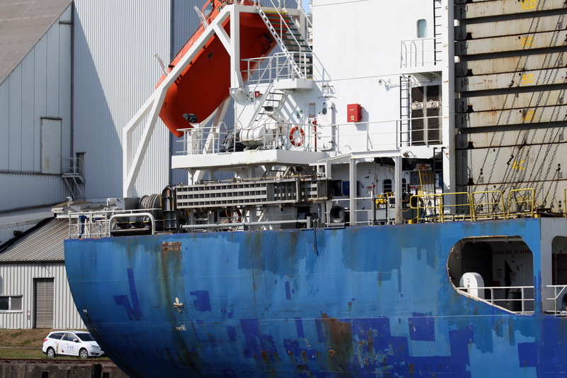 Das Heck mit Rettungsboot, Nationalflagge, Schiffsnamen, Heimathafen und IMO Nummer / The stern with lifeboat, national flag, ship name, home port and IMO number
