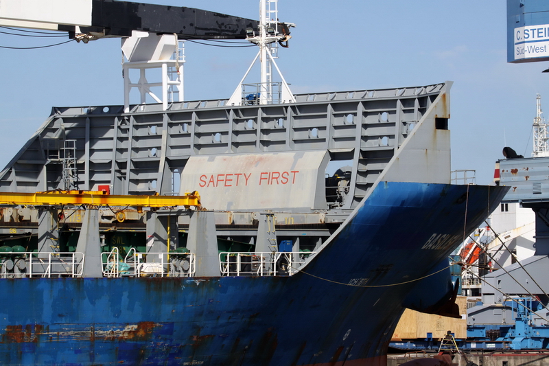 Die Zwischendeckpontons sind vor dem Aufbau gestaut und gelascht / The tween deck pontoons are stowed and lashed in front of the accommodation