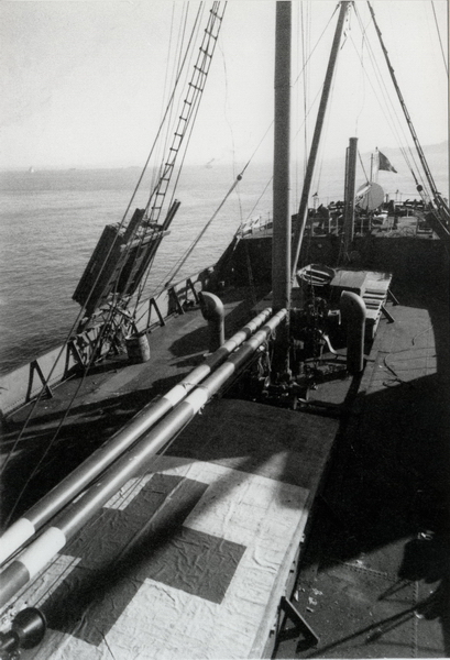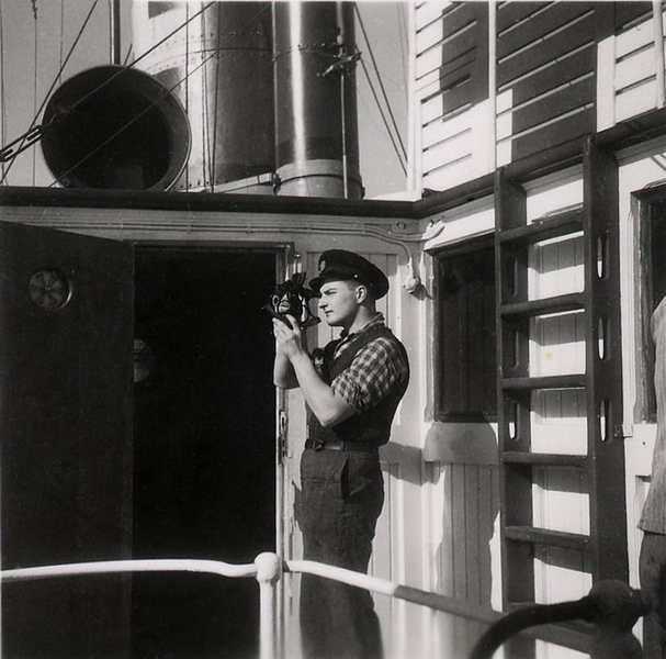 3. Offizier J. Voirol auf der Brücke beim "Sonneschiessen" mit dem Sextant / 3rd officer J. Voirol on the bridge ‘shooting the sun’ with the sextant