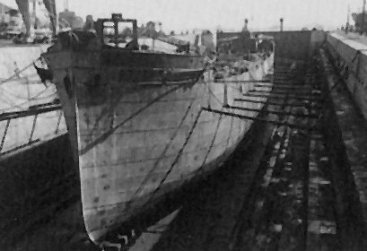 Funkoffizeir Harald Ihringer vor dem blanken Rumpf ohne Aufbauten im Dock in Lissabon / Funkoffizeir Harald Ihringer in front of the bare hull without superstructure in the dock in Lisbon