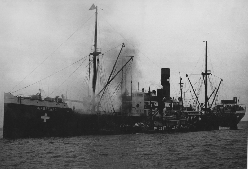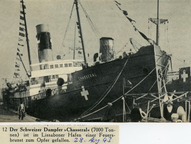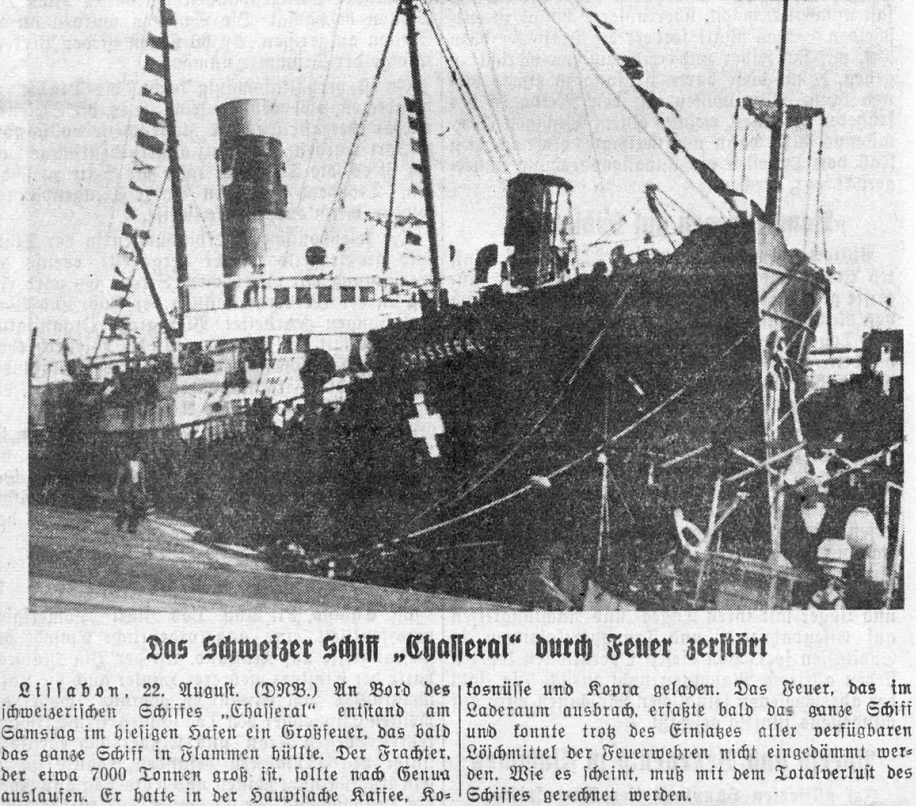 Schweizer Pressebericht vom 26. April 1944 über den britischen Luftangriff vor Sété auf die CHASSERAL. Das Foto jedoch zeigt den Dampfer in Lissabon als in der Copraladung ein Brand entstand am 21.08.1943 / Swiss press report from 26 April 1944 on the British air raid on the CHASSERAL off Sété. However, the photo shows the steamer in Lisbon when a fire broke out in the copra cargo on 21 August 1943