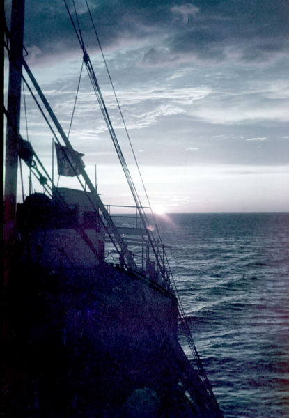 Blick von mittschiffs nach achtern zum Sonnenuntergang