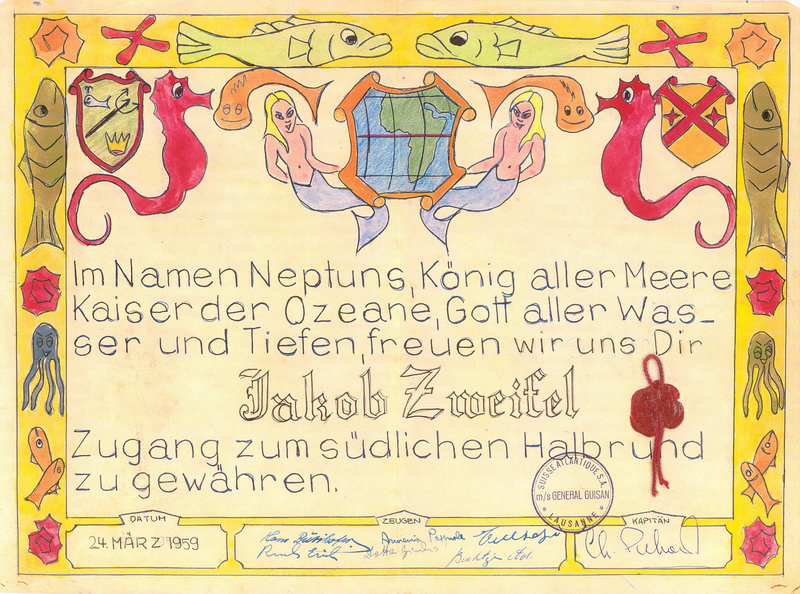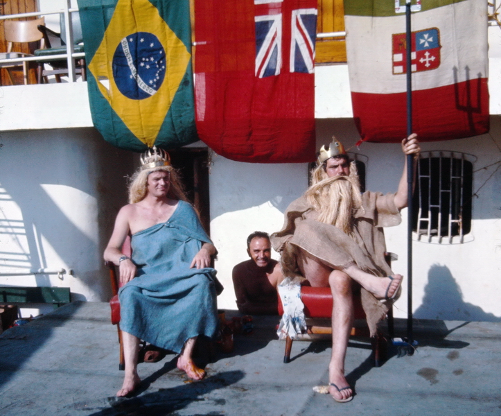 Äquator Taufe (Auf der Fahrt von La Pallice Frankreich nach Lumut Malaysia fand am 16.06.1969 bei der Überquerung des Aequators die Aequatortaufe statt) Neptun: Unser Chippi (Zimmermann), Ochsner Josef, genannt «Daggi» (Ist leider in Einsiedeln verstorben) Thetis: Chief - Steward, Meier Stephan (Ist leider in Biel verstorben)