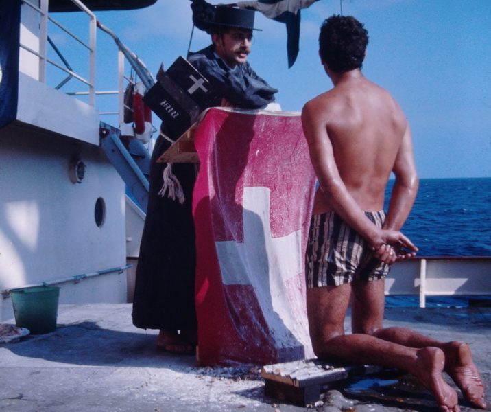Pfarrer: 2nd Steward, Sigrist Hans-Ruedi, genannt «Jonny»: Pfarrer Jonny nimmt vom Täufling Masch. Assi. Egger die Beichte ab! Bildherkunft / Photosource: © SwissShips / © Ottavio Loretini |