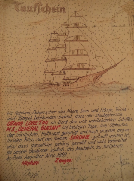 Äquator Taufe (Auf der Fahrt von La Pallice Frankreich nach Lumut Malaysia fand am 16.06.1969 bei der Überquerung des Aequators die Aequatortaufe statt)
