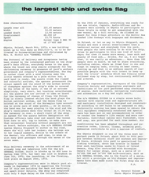 Commissioned on 07.12.1971 by A/S Olsen & Ugelstad from Oslo. Planned name .....FJELL. Built in sections of up to 400 tonnes. Purchased during construction by associated partners of Suisse-Atlantique. Planned for service under the Liberian flag and floated into the dock as LONDRINA on 8 March 1972 (launching). Call sign 6ZEL, Liberia register no. 4345. According to other sources, the ship was only launched on 25 August 1972. On 08.03.1973 the ship was christened GENERAL GUISAN by Mrs E. Richir. The ship was delivered on 10 March 1973 to Helica S.A., Geneva (Management: Société d'Armement Maritime Suisse-Atlantique S.A., Lausanne), home port Bâle. Call sign: HBFS. At that time, the GENERAL GUISAN was the largest ship flying the Swiss flag. From 1986 the ship's management was called Suisse-Atlantique Société de Navigation Maritime S.A., Lausanne. Sold on 9 September 1987 in Antwerp to Latana Shipping Corp (management: Stathatos & Co. Ltd., London), Piraeus and renamed PARTHENON. Call sign SZUN. Official No.: 3264, re-measured with GRT: 29,845 / NRT: 22,186 / DWT: 55,069. 1988 Sold to Audacia Shipping Corp (Management: Ocean Tramping Co. Ltd., Hong Kong), Monrovia, and renamed TRANSOCEAN. Call sign ELDI5. Official No.: 8284, re-measured with GRT: 30,232 / NRT: 21,203 / DWT: 55,069. In 1995 the management was transferred to COSCO (Hong Kong) Shipping Co Ltd, Hong Kong. Sold on 23 July 1997 to K. Z. Enterprise in Chittagong for scrapping, where demolition of the ship began on 24 July 1997. Sources: