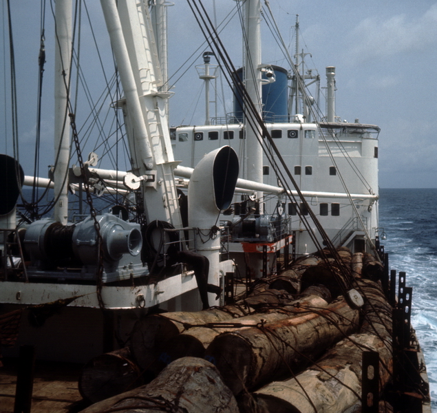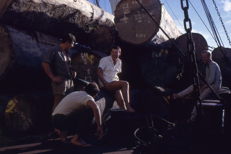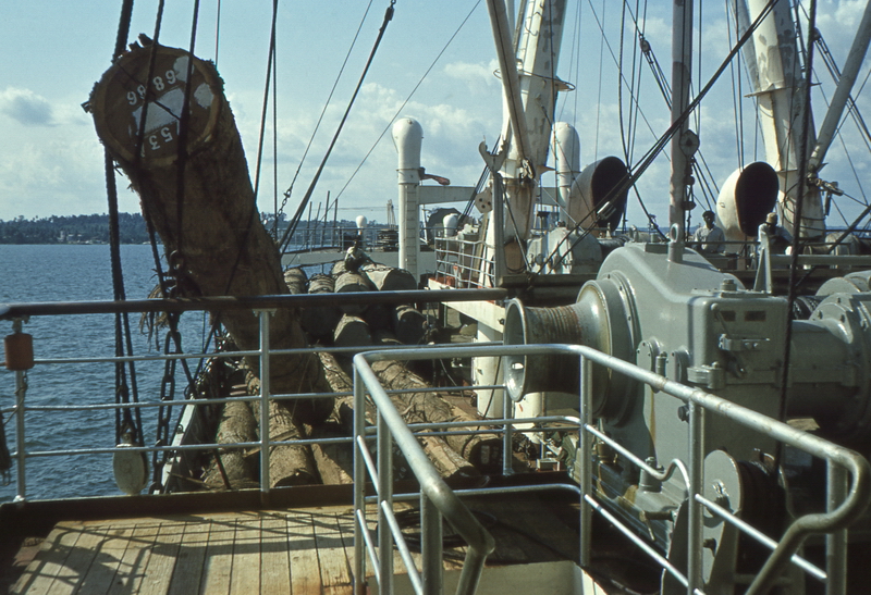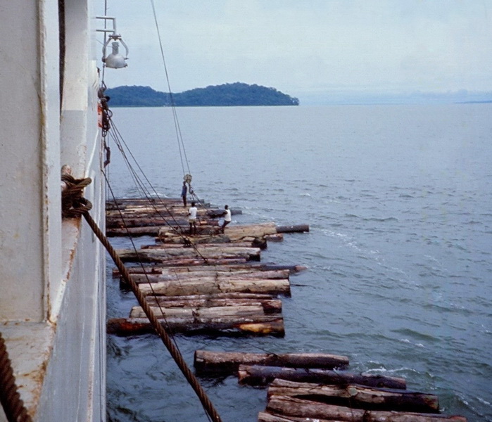 Holz laden vor Owendo (hinter Libreville, Gabun Westafrika), damals eine unberührte Bucht, heute liegt hier der Hafen von Libreville / Loading logs off Owendo (behind Libreville, Gabon West Africa), at that time a pristine bay, today lies here the port of Libreville