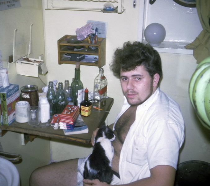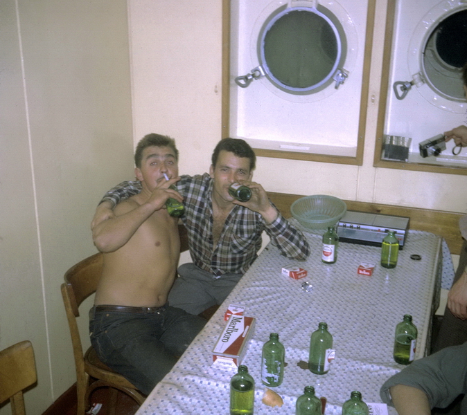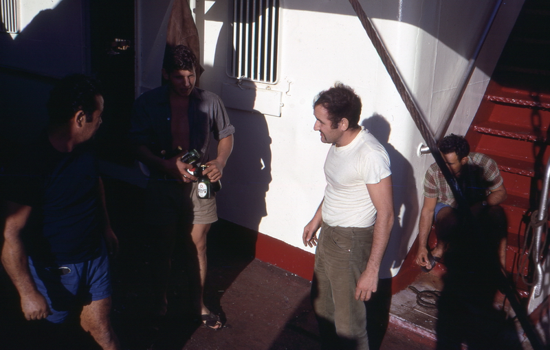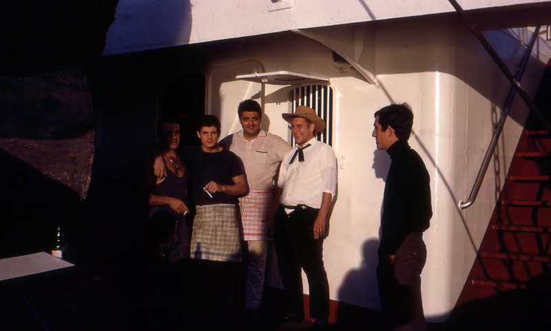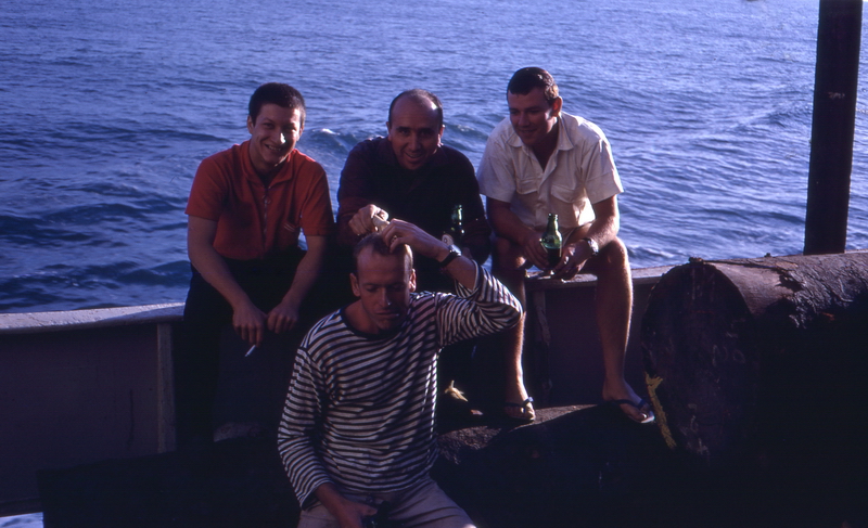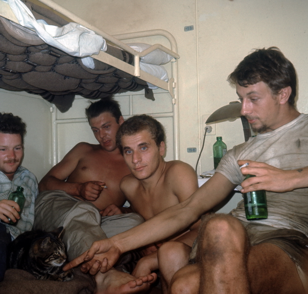 In der Reiniger-Kabine, von links Hans-Peter Schwab, Bordkatze Katrin, Gerhard Diener, der welsche Messboy und Hansjürg Vogt † (Mechaniker)