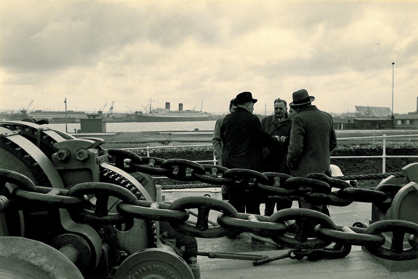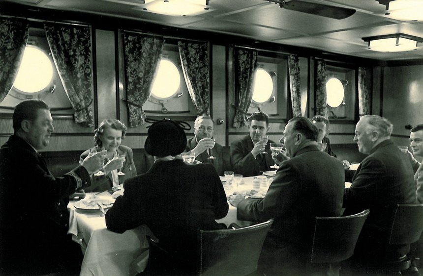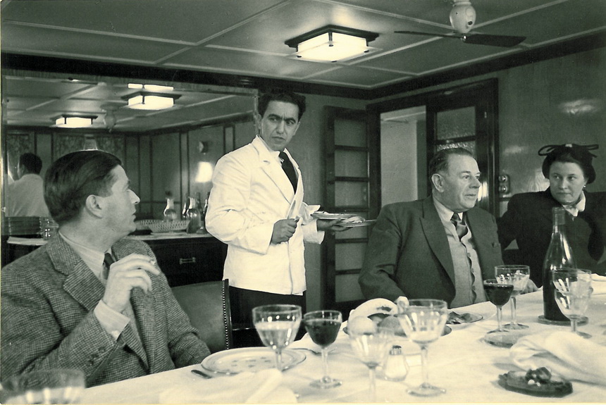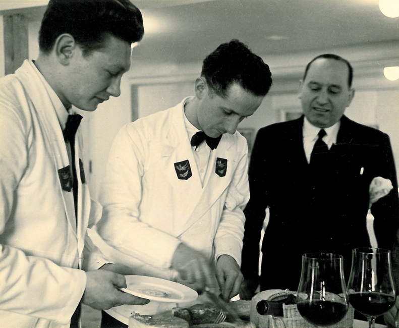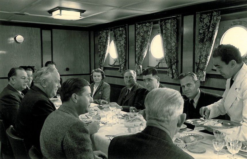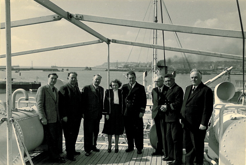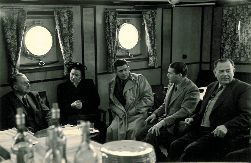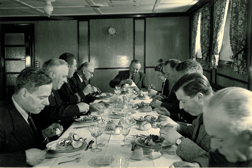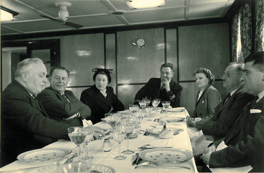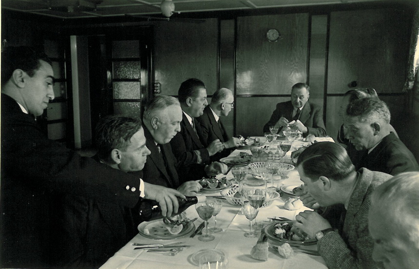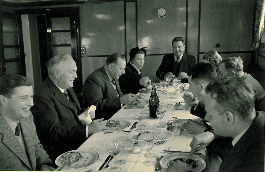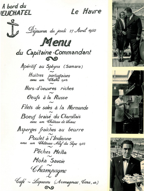 Les photos de l'album No. 17 et 20 de Gérard Bourquin, le petit-fils de Armand Bourquin ont apparemment été prises durant deux inspections du navire au Havre. Malheuresement, les photos ne sont pas datées, ni commentées, mais la mère de Gérard Bourquin était capable d'identifier quelques unes des personnes présentes sur les images, merci beaucoup à Madame Bourquin. A voir le menu photographié, nous pouvons estimer que un de ces voyages se passa en Avril 1950. Foto dagli albi nr. 17 e 20 di Gerard Bourquin, un nipote di Armand Bourquin, riprese durante due viaggi d'ispezione in auto a Le Havre. Purtroppo le foto no sono datate ne commentate, ma la madre di Gerard Bourquin era in grado di riconoscere alcune persone, mille grazie. Per via della lista del menu, un viaggio era avvenuto nel aprile del 1950. Photos from Album No. 17 and 20 from Gérard Bourquin, the grandson of Armand Bourquin, taken during two inspection trips by car to Le Havre. Unfortunately the photos were not dated, nor commented, but the mother of Gérard Bourquin was able to identify some of the persons shown, many thanks. Obviously, as shown from the menu card, one of the trips was made in April 1950.