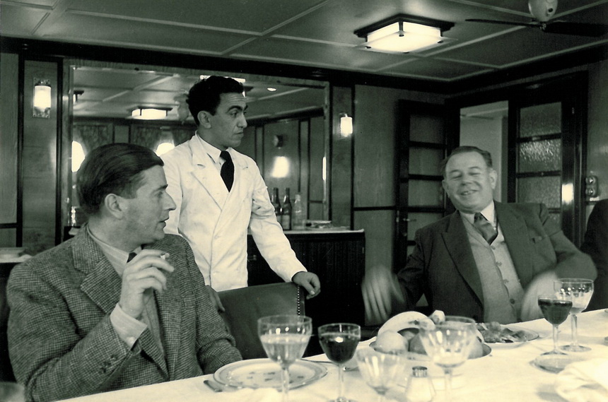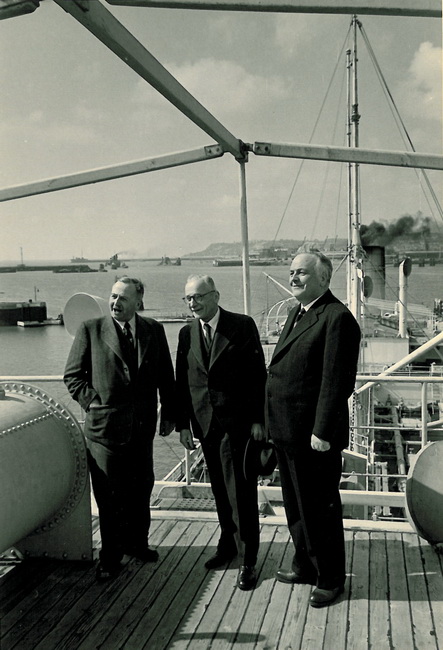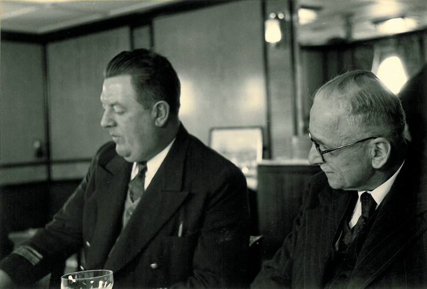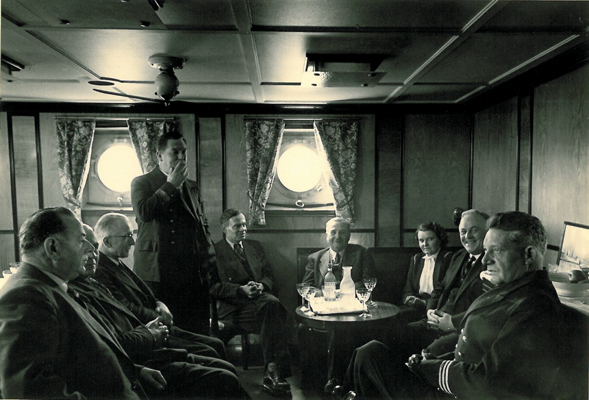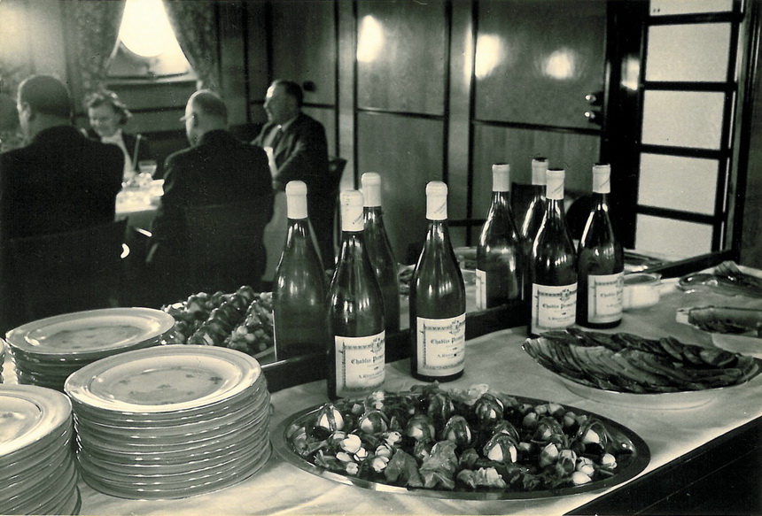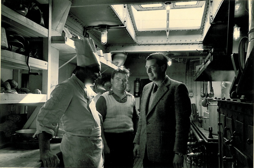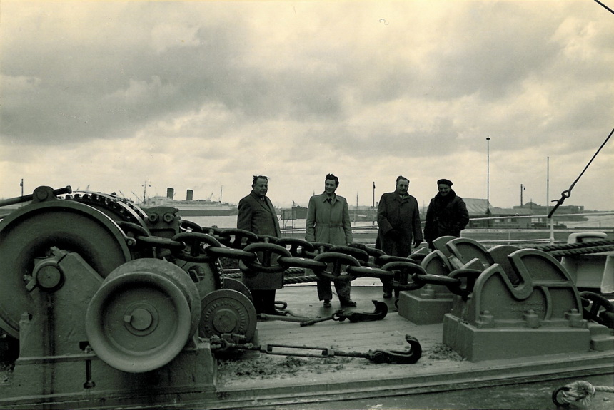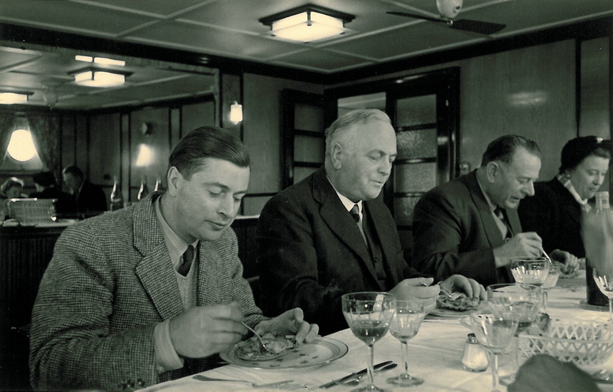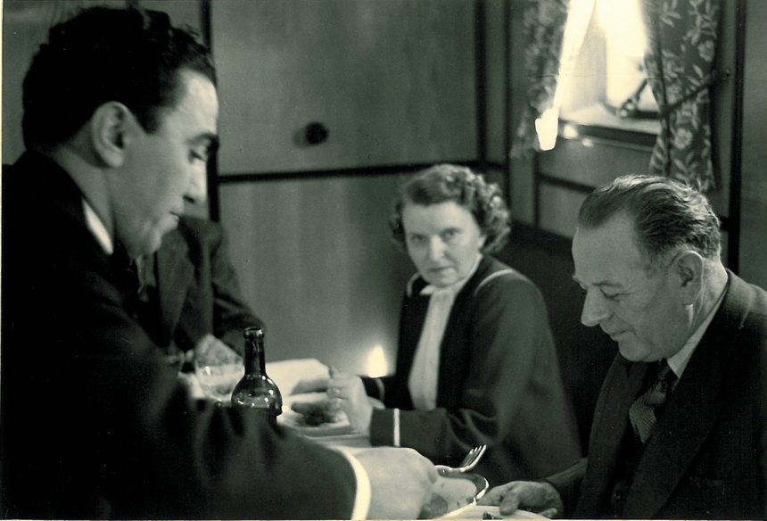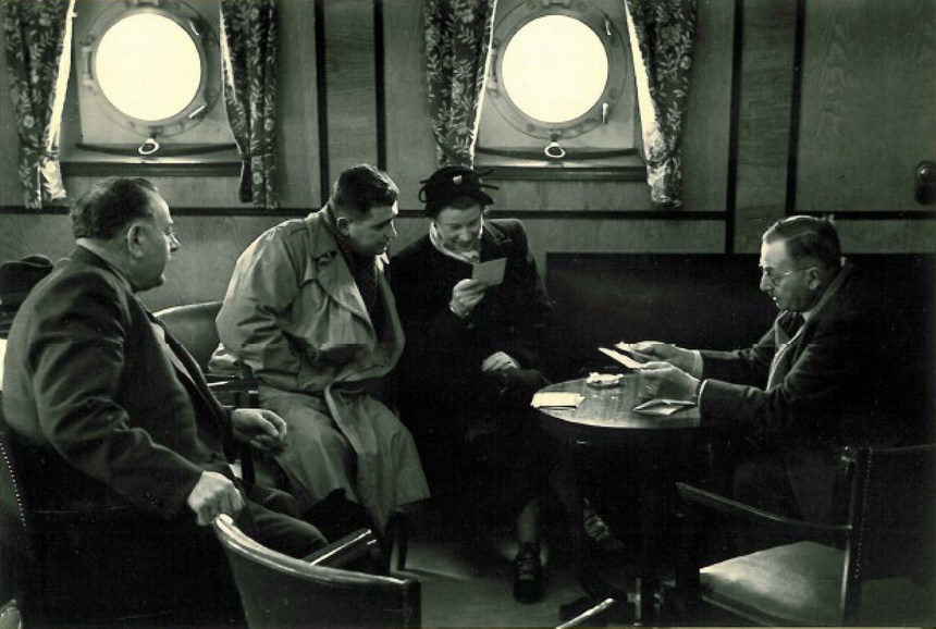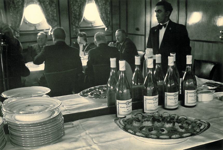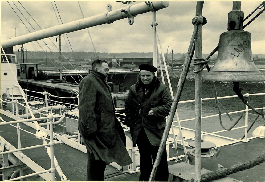 Les photos de l'album No. 17 et 20 de Gérard Bourquin, le petit-fils de Armand Bourquin ont apparemment été prises durant deux inspections du navire au Havre. Malheuresement, les photos ne sont pas datées, ni commentées, mais la mère de Gérard Bourquin était capable d'identifier quelques unes des personnes présentes sur les images, merci beaucoup à Madame Bourquin. A voir le menu photographié, nous pouvons estimer que un de ces voyages se passa en Avril 1950. Foto dagli albi nr. 17 e 20 di Gerard Bourquin, un nipote di Armand Bourquin, riprese durante due viaggi d'ispezione in auto a Le Havre. Purtroppo le foto no sono datate ne commentate, ma la madre di Gerard Bourquin era in grado di riconoscere alcune persone, mille grazie. Per via della lista del menu, un viaggio era avvenuto nel aprile del 1950. Photos from Album No. 17 and 20 from Gérard Bourquin, the grandson of Armand Bourquin, taken during two inspection trips by car to Le Havre. Unfortunately the photos were not dated, nor commented, but the mother of Gérard Bourquin was able to identify some of the persons shown, many thanks. Obviously, as shown from the menu card, one of the trips was made in April 1950.