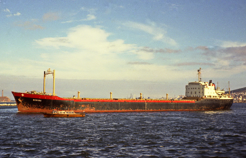 Dieses Schiff wurde von der Werft Jos. Boel & Fils, Tamise (in Flämisch: Jos. Boel & Zonen, Temse) gebaut, eine Werft an der Schelde ungefähr 25 Kilometer stromaufwärts von Antwerpen *). Der Stapellauf erfolgte am 11.01.1958 und am 24.05.1958 wurde die REGINA an ihre Eigner Regina Schiffahrts AG, Basel abgeliefert, die vermutlich Dr. Dieter Bührle finanziert hatte. Unter Schweizer Flagge in Dienst gestellt (offizielle Nr.: 57, Rufzeichen: HBDR) und von der Schweizerischen Reederei in Basel betrieben. Die REGINA war der allererste Bulk Carrier unter Schweizer Flagge, allerdings nach heutigen Begriffen ein kleines Schiff von nur 14'468 Tonnen Tragfähigkeit. Regina ist lateinisch und bedeutet Königin oder Herrscherin, vielleicht meinten die Namensgeber „die Herrscherin der Meere“ (Regina ist auch ein weiblicher Vorname). Das Schiff verkehrte nur im Atlantik, hauptsächlich von der US-Ostküste und Golf, sowie von Kanada nach Nordeuropa und ins westliche Mittelmeer. Port Churchill in der Hudson Bay stand öfters auf dem Fahrplan. Die Hudson Bay im Norden Kanadas ist normalerweise eisbedeckt und kann nur im Sommer während ungefähr drei Monaten angelaufen werden. Abstecher nach Rio de Janeiro und einige Male nach Afrika, Dakar, Pointe Noire, Kapstadt und einmal sogar nach Lorenzo Marques und Beira (Südostküste Afrikas), gaben eine kleine Abwechslung von der Nordatlantikfahrt. Kohle und Getreide von Nordamerika für Europa, Düngemittel von Europa nach Südafrika und Getreide zurück nach Europa waren die meisten Massenprodukte die transportiert wurden. Ab und zu transportierte sie auch Sackgut, vermutlich Zement (die REGINA war nur ein kleines Schiff von knapp 15'000 Tonnen und in den afrikanischen Häfen waren Umschlagseinrichtungen für Massengüter noch kaum vorhanden). Die Besatzung von 36 Mann bestand zum grössten Teil aus Schweizern, die oben geschilderten Reisen entsprachen bei den meisten Leuten nicht ihren Vorstellungen von der Seefahrt. Aber es gab auch Ausnahmen, Kapitän Domingo Bücheler liebte die vielen Reisen nach Grossbritannien, konnte er jeweils seine junge Frau besuchen oder sie konnte an Bord kommen. Die Liegezeiten im Königreich waren meistens sehr lang. Kürzlich berichtete uns ein Bekannter, der in der Maschine gefahren hat, dass das Bordleben von der ständigen „Zünderei“ (Sticheleien) Deck gegen Maschine total vergiftet war und er deshalb nach einer Reise schon wieder abmusterte. Andere erzählten das Gegenteil, es wäre ein angenehmes Fahren auf der REGINA gewesen. Nun, zwei, drei Mann können natürlich den Unterschied machen und jeder hofft, dass sie bald wieder weg sind. Das Bordleben kann wechseln, genauso wie das Wetter. In 1963 mussten die Decksleute die Topside-Ballasttanks von Rost und Schlamm sauber machen, eine schweisstreibende, dreckige Arbeit. Zudem war das Begehen des schrägen, manchmal glitschigen Tankbodens, besonders bei Seegang recht mühsam. Der gesammelte Rost und Dreck musste in Eimern zum Mannloch am hinteren Ende des Tanks geschleppt und auf Deck gehievt werden.