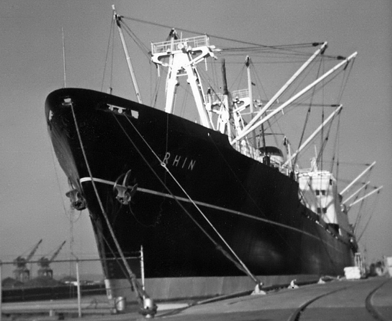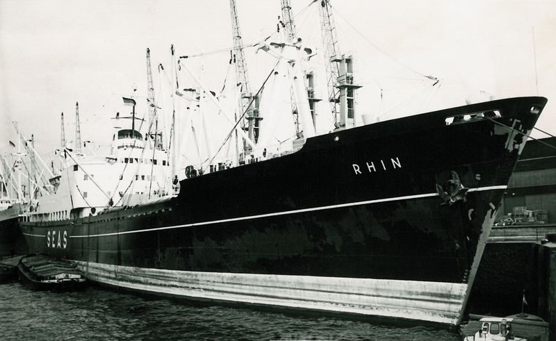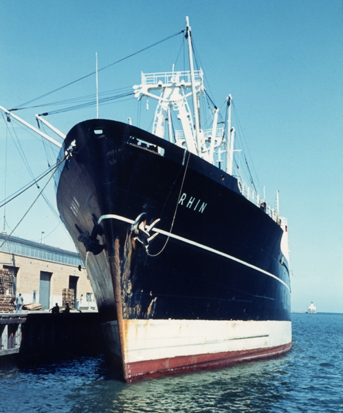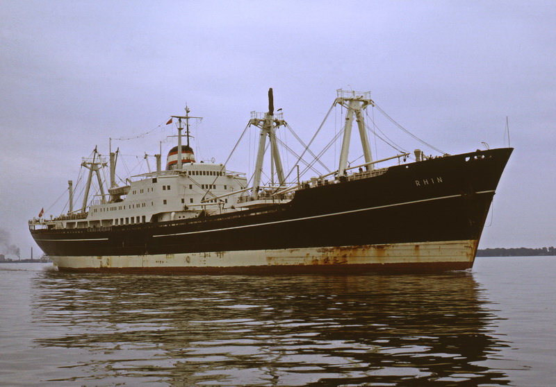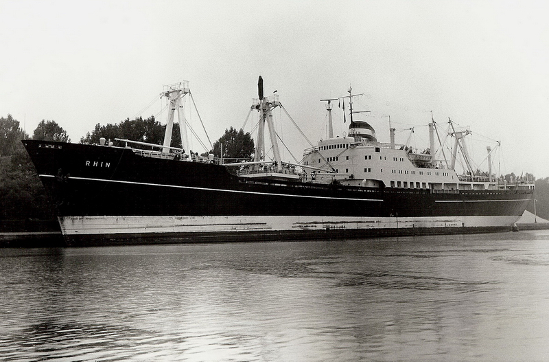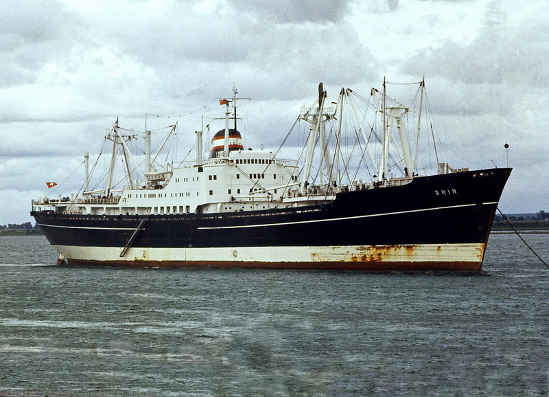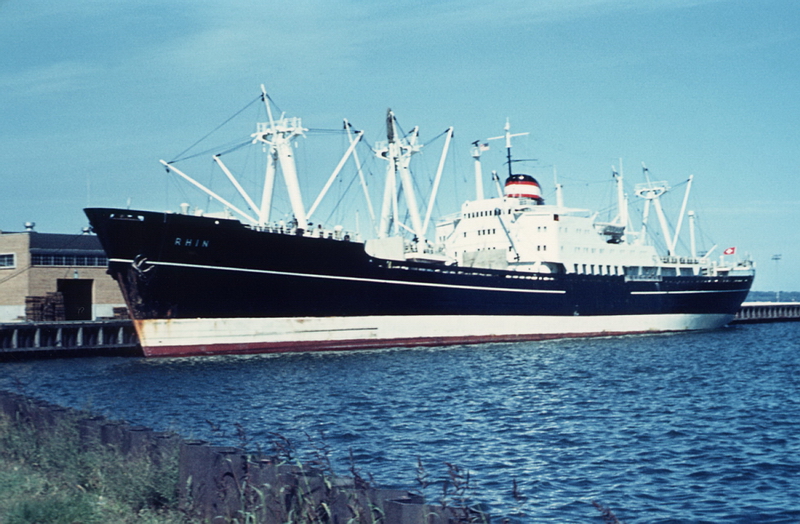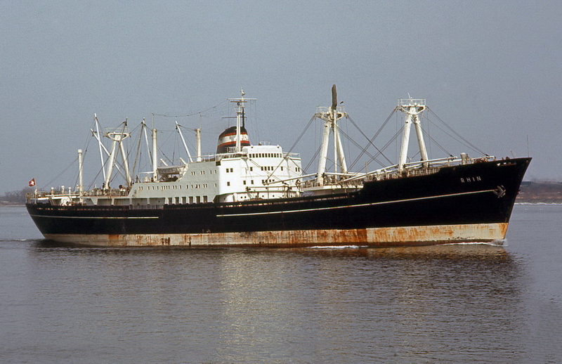 Come la gemella RHONE, anche questa nave da carico originariamente era stata commissionata dalla Louis Dreyfus & Cie. Dunkerque, Francia, presso il cantiere Stocznia Gdanska im. Lenina, Gdansk/Danzica, Polonia (numero di costruzione: B54/23). In fase di costruzione assegnata alla affigliata Getreide Finanzgesellschaft “Socel” Zurigo. Al Barone Hans Heinrich Thyssen-Bornemisza, proprietario della Suisse-Outremer S.A. era stato assegnato la quota di ⅓. Ultimata il 30-09-1961, immatricolata però appena il 02-11-1961 con il nome RHIN sotto bandiera Svizzera con porto d’scrizione Bâle/Basilea (Numero ufficiale: 66, nominativo internazionale: HBDS) e consegnata alla proprietaria, la Bernina Hochsee-Schiffahrts AG, Coira. Pare che c’erano da risolvere alcune domande legali riguardanti la registrazione, perciò il ritardo. Con la gestione a sua volta si occupava la Suisse-Outremer S.A. de Gérance et d’Affretement Maritimes, Ginevra. La RHIN era concepita specialmente per i viaggi verso il Sudamerica, vedi commento nella storia della nave RHONE. Assieme alla nave gemella RHONE era stata intromessa nel servizio di linea della SEAS, Societé Europe-Atlantique du Sud, una unione di armatori francesi offrendo servizi tra il Nordeuropa (Francia e porti del Nordeuropa fino ad Amburgo) e la costa orientale del Sudamerica (Brasile, Uruguay e Argentina). L’equipaggio era composto di 40 persone, prevalentemente cittadini Svizzeri. Nell’estate del 1963 la RHIN eseguiva due viaggi transatlantici verso il Canada e i Grandi Laghi. Agli inizi del 1964 segue un viaggio invernale verso Halifax, St. John e New York e in primavera per l’ultima volta era diretta a Duluth sul Lago Superiore (Lake Superior). Il 01-09-1963 la gestione cambia sede e nome diventando Suisse-Outremer Bereedungs-und Befrachtungs AG, Zurigo. Il 25-10-1966 ceduta alla Compagnie de Navigation d’Orbigny (C.N.O.), Rouen e rinominata LUCHON. Sotto bandiera francese con porto d’iscrizione Rouen rimane in servizio sulla stessa linea verso il Sudamerica (nominativo internazionale: FNTK). Dal 1979 entra in gestione alla Maldives Shipping Ltd., Bombay. Il 20-03-1980 venduta alla Belle Shipping Co. Panama (management: Asia Shipping Co. Ltd., Hong Kong, rinominata PARAMOUNT e intromessa in servizio sotto bandiera panamense (numero matricola: 9314-PEXT 1 / 10444-80, nominativo internazionale: H8PM). Nel 1983 passa alla Visvanath Rupa & Co., Durakana (Bombay). Il 12-07-1983 la nave arriva a Bombay, dove a novembre del 1983 inizia la demolizione. Fonti: